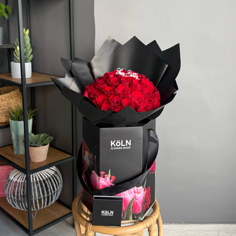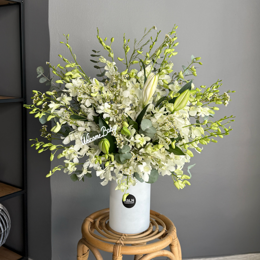 هذه الفازة الجميلة والأنيقة تحتوي على زهور البيبي أوركيد والليلي كازابلانكا وأوراق الأوكالبتوس.