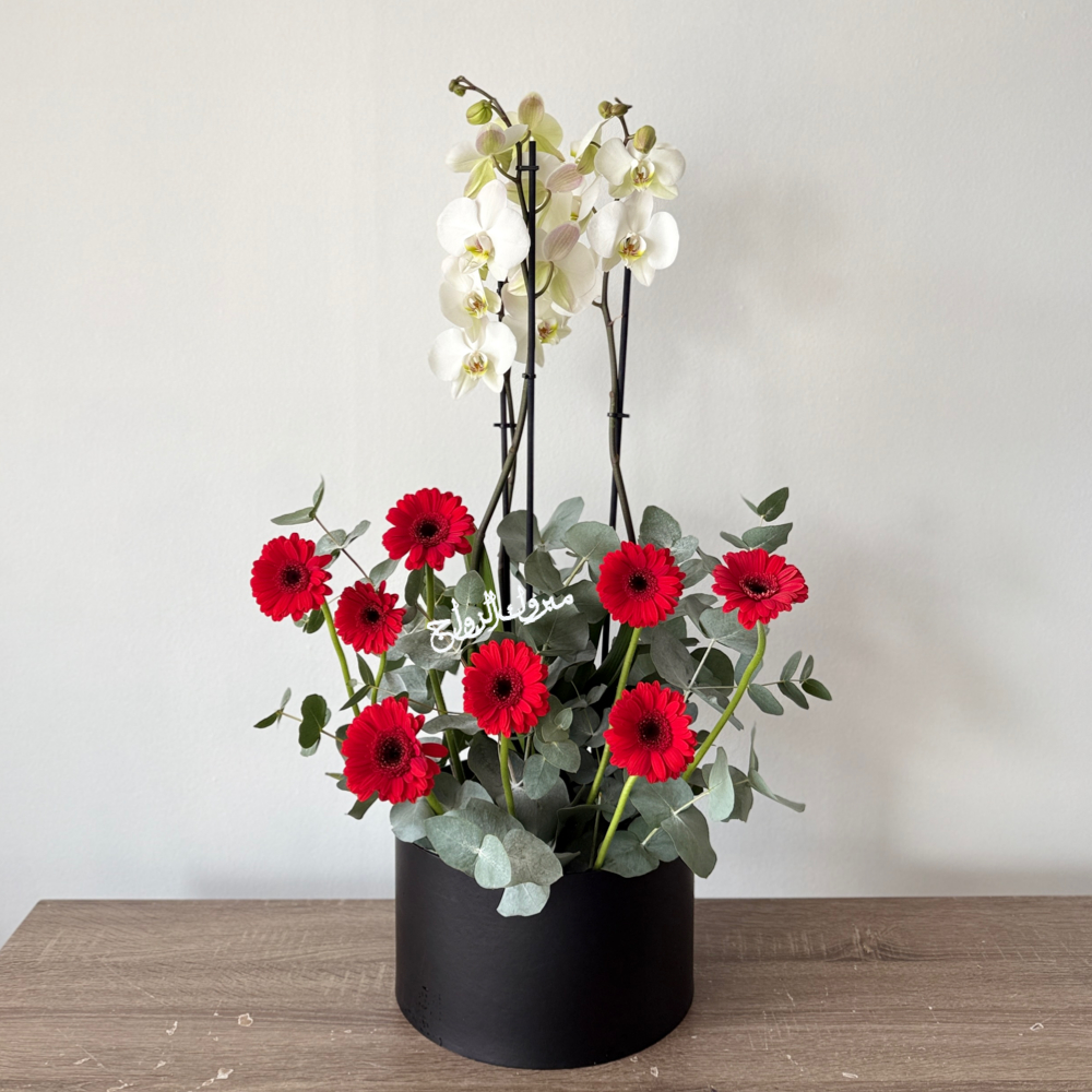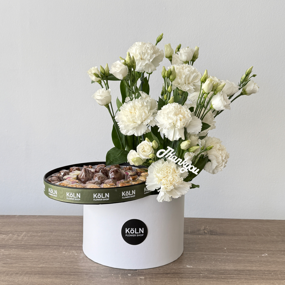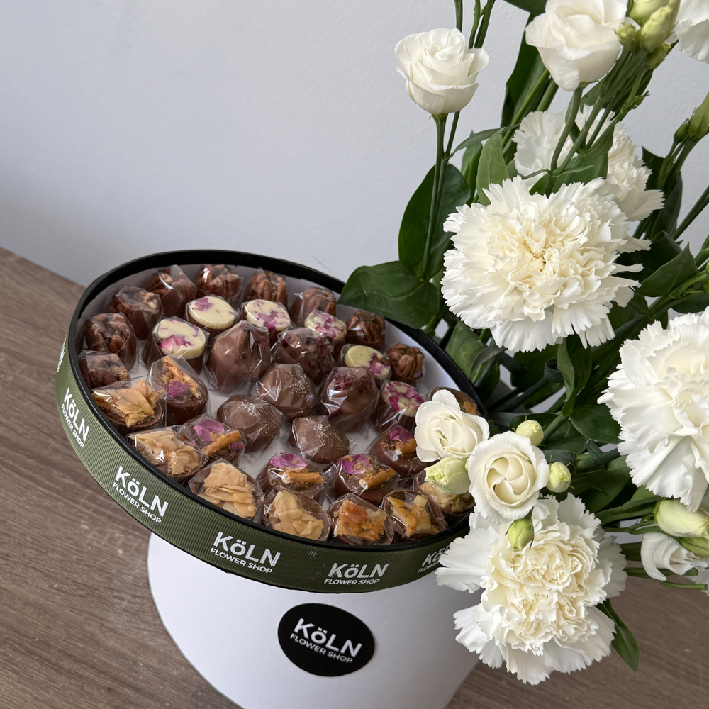 تحتوي هذه الباقة الجميلة على زهور الإستوما والكارنيشن مع حلويات القهوة البلجيكية الفاخرة.