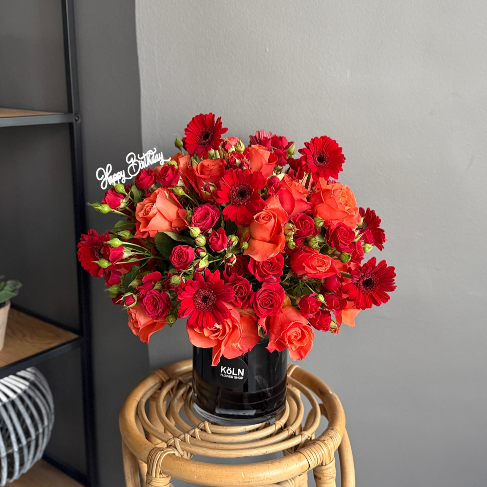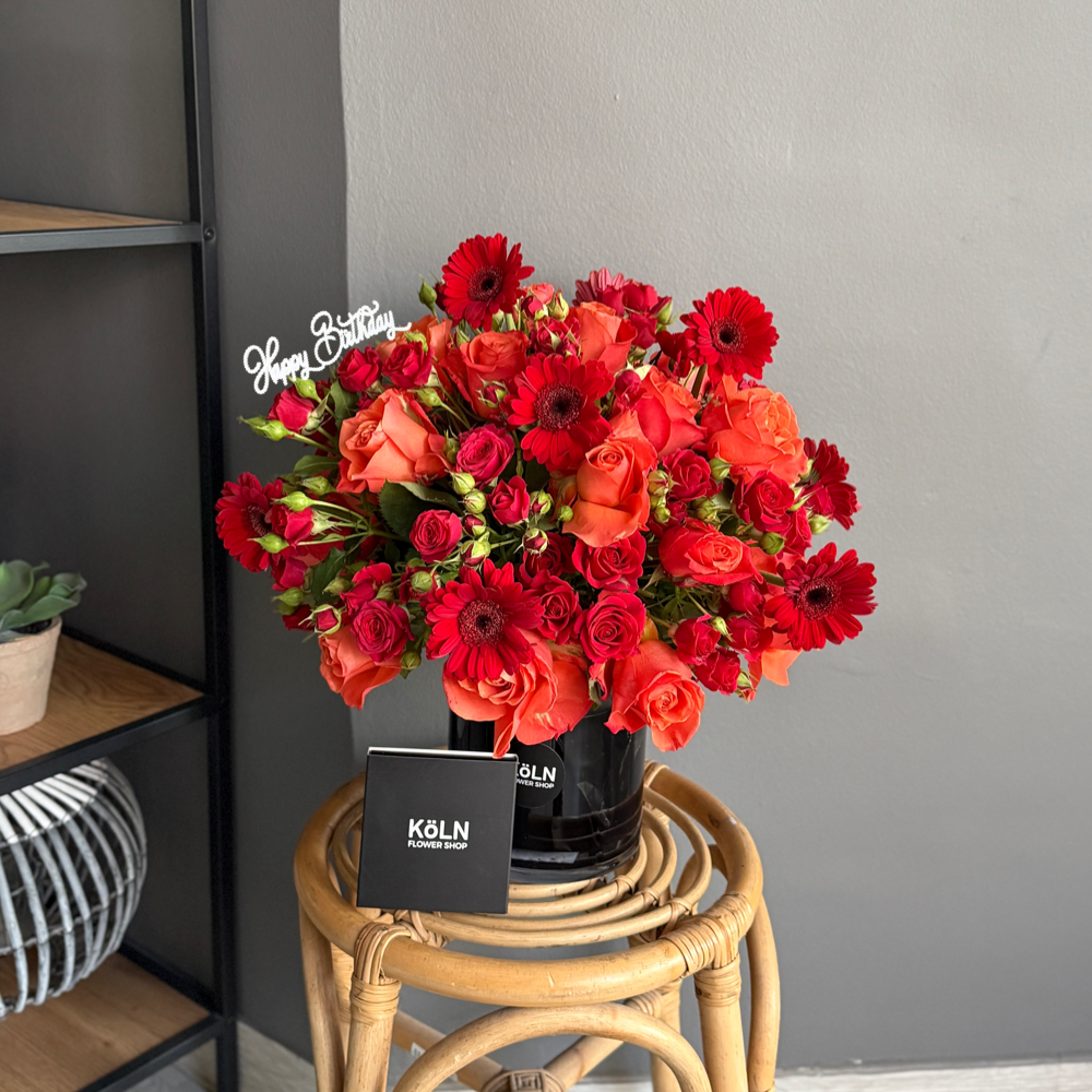 فازة تحتوي على الجوري، البيبي جوري والجيربيرا مع الشوكولاتة البلجيكية.