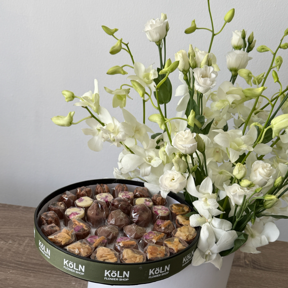 تحتوي هذه الباقة الجميلة على زهور البيبي أوركيد والإستوما مع حلويات القهوة البلجيكية الفاخرة.