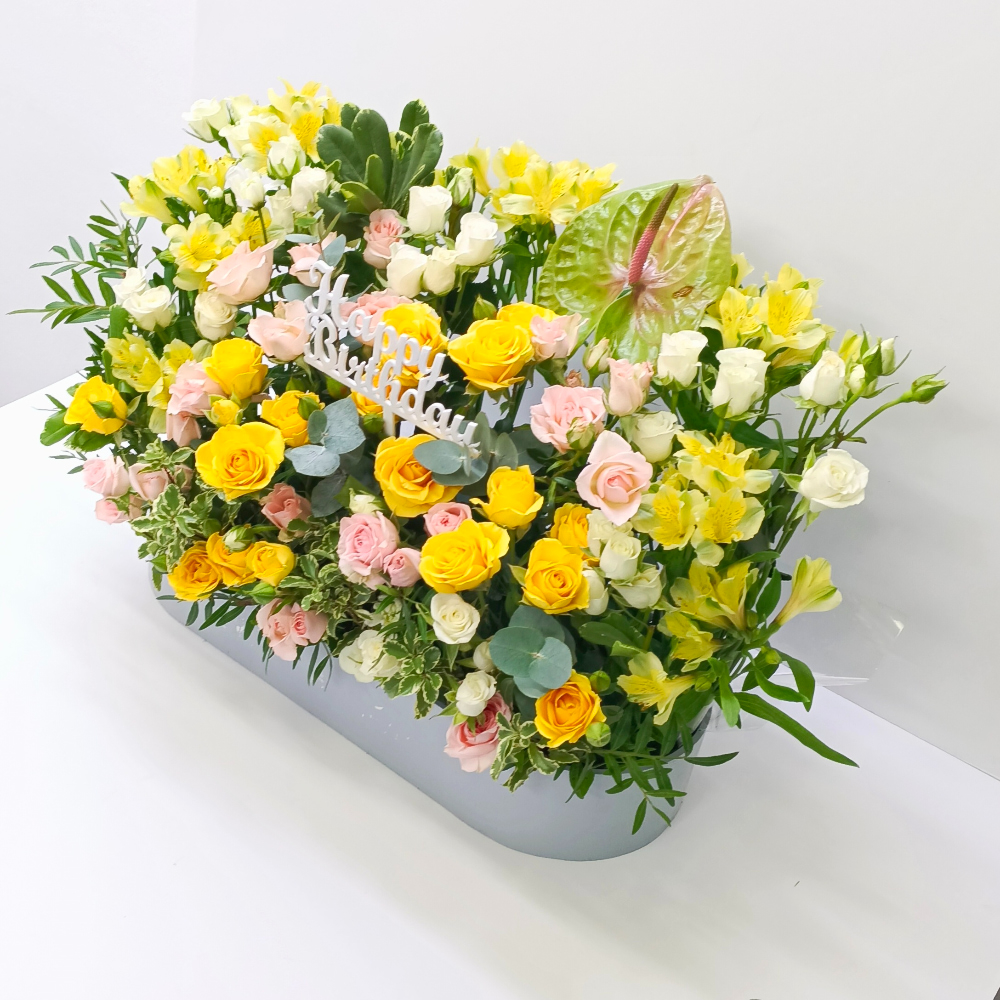 بوكس يحتوي على أزهار البيبي روز والانثوريوم.