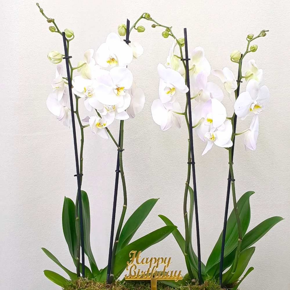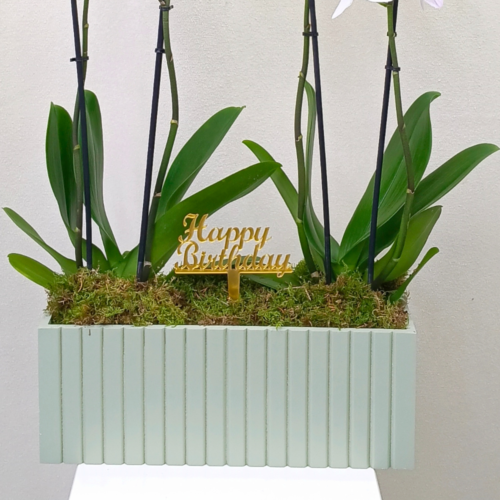 باقة أنيقة مليئة بنباتات الأوركيد المزهرة مع تغريسة أكريليك.