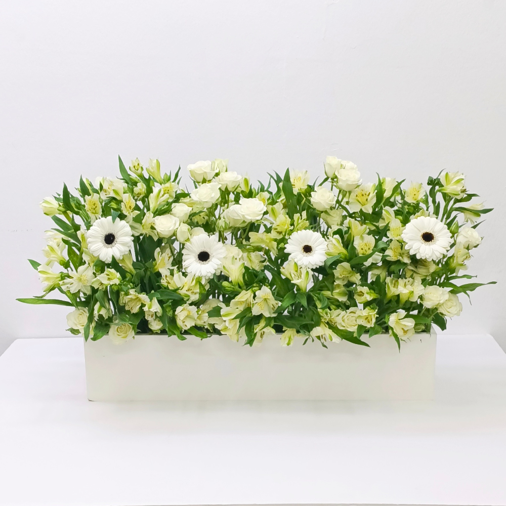 باقة بألوان زاهية من الجربيرا والألستروميريا والجوري مع صندوق خشبي.