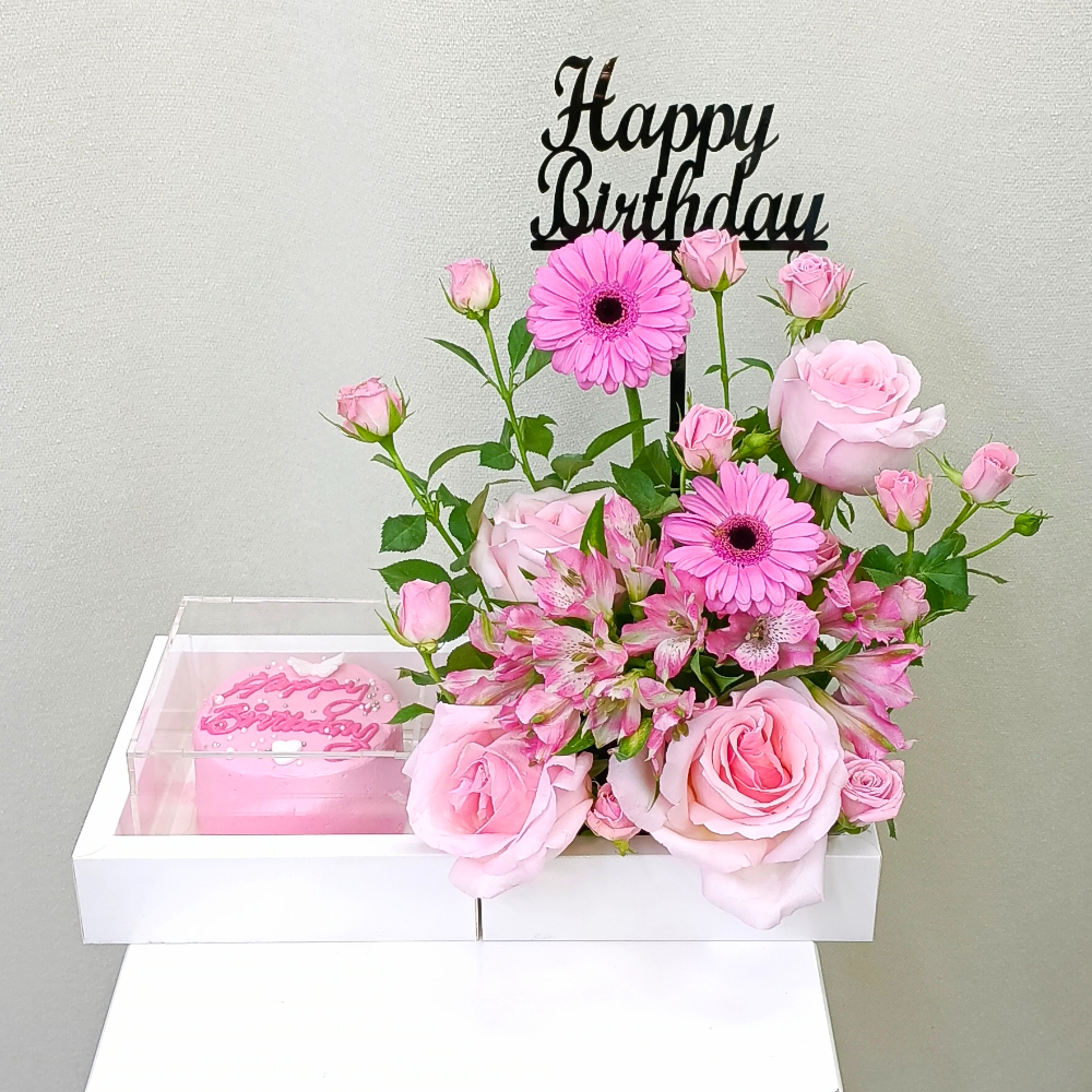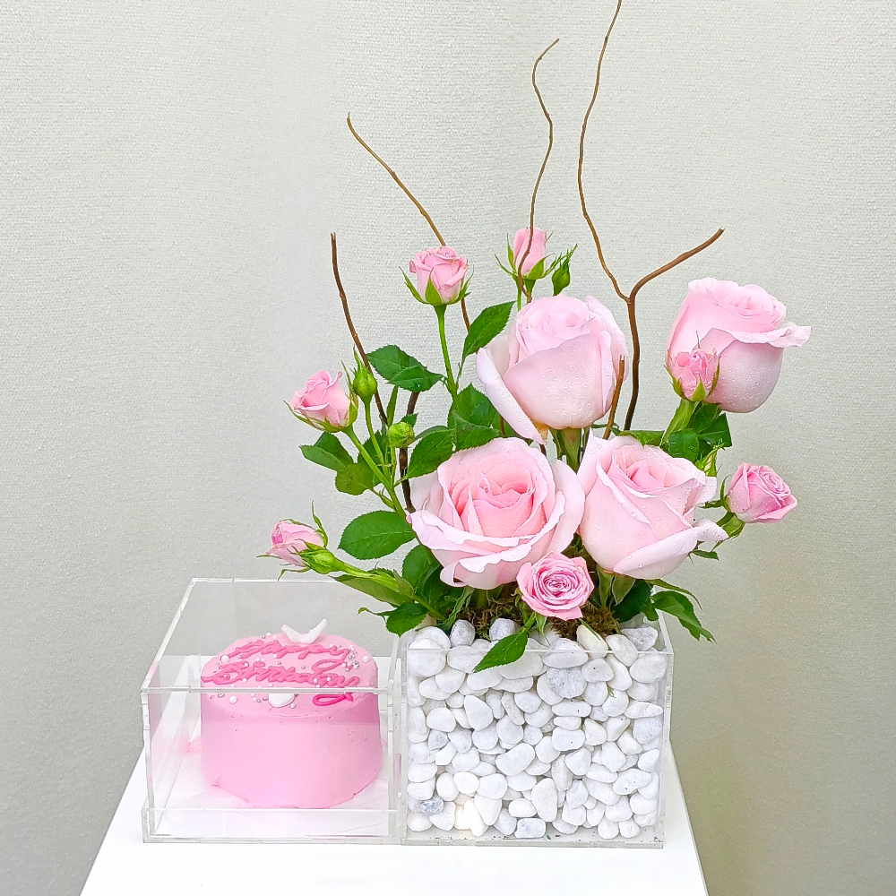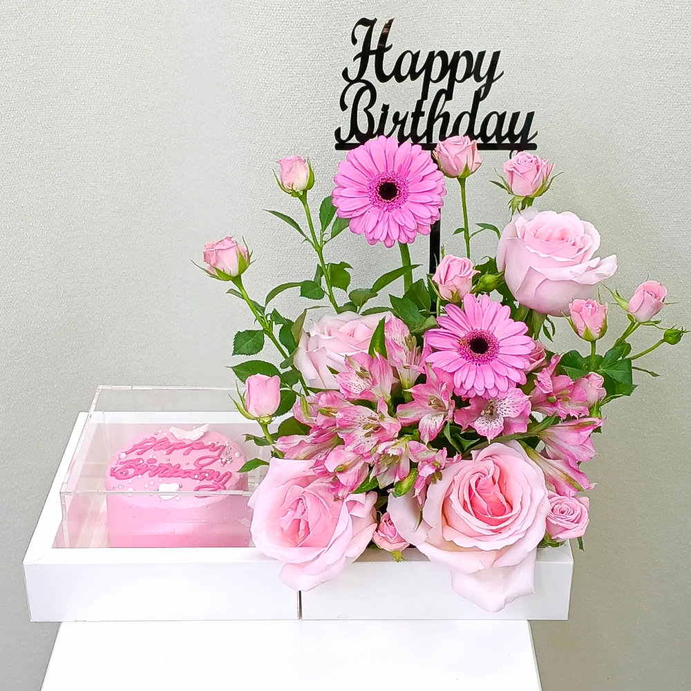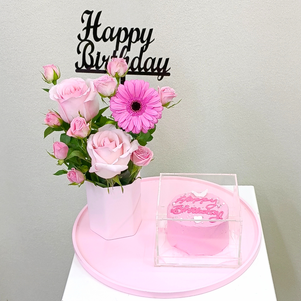 باقة تحتوي على زهور الجوري، البيبي جوري، الجيربيرا والألستروميريا الوردية مع كيكة صغيرة، مرتبة بشكل جميل في صينية.