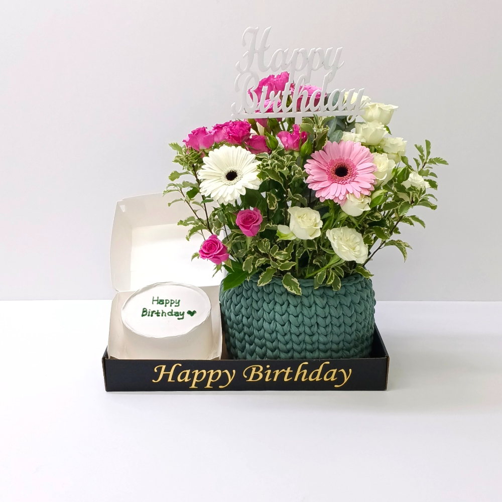 بوكيه يحتوي على زهور الجوري وجربيرا مع فازة كيكة صغيرة مصنوعة يدويًا في تركيا.