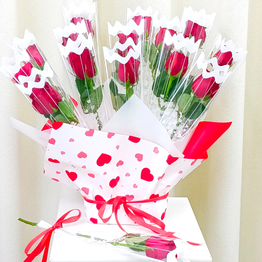 باقة تحتوي على الجوري الأحمر، مغلفة بشكل منفرد ومرتبة بشكل جميل.