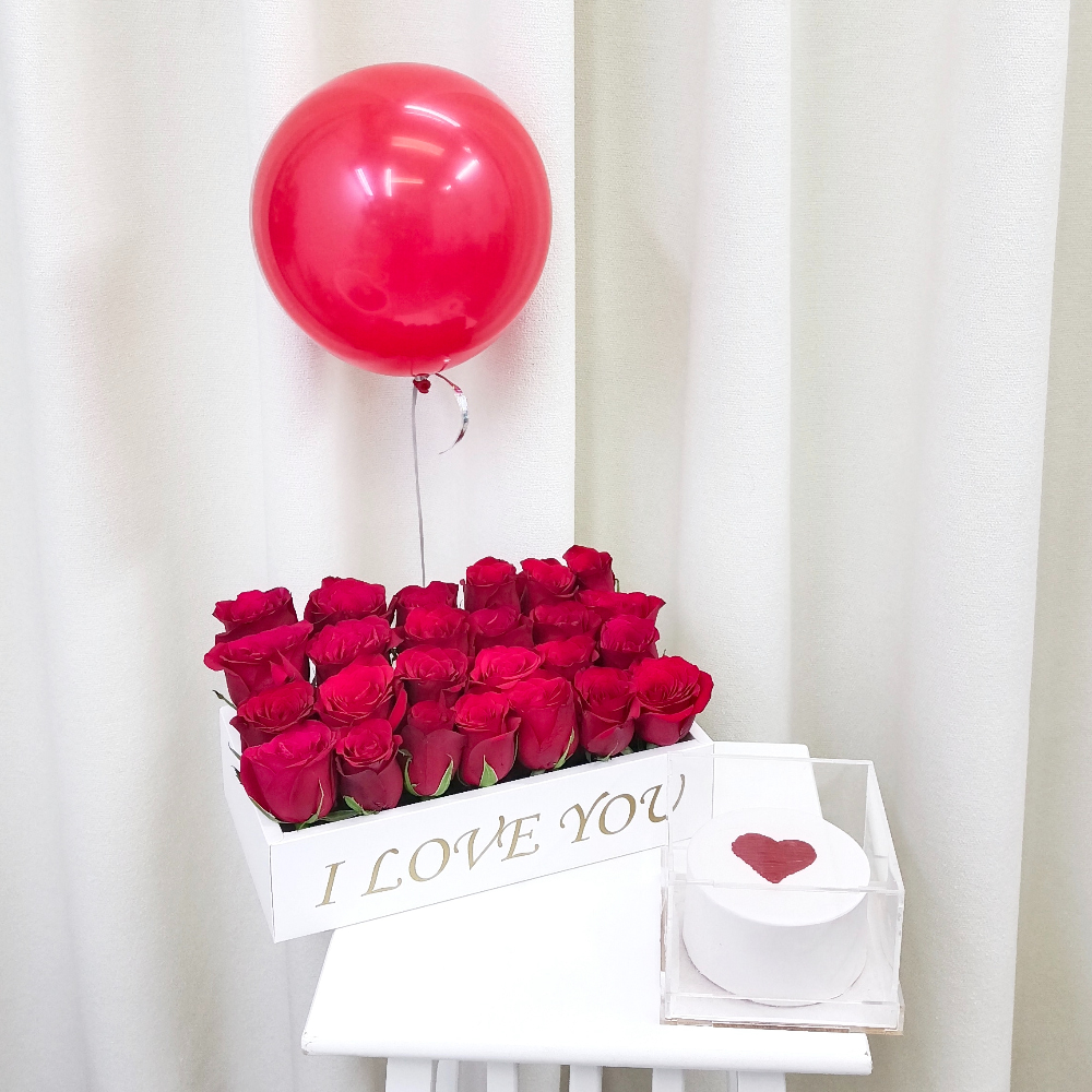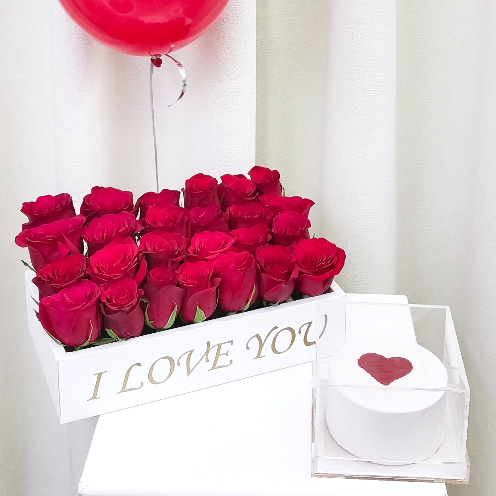 باقة جوري أحمر مع كيكة صغيرة بنكهة الفانيليا.