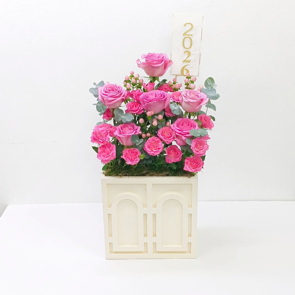 باقة تحتوي على زهور الجوري والبيبي جوري الوردية، مرتبة بشكل جميل في صندوق مع عود فارغ من الأكريليك للهدايا النقدية.