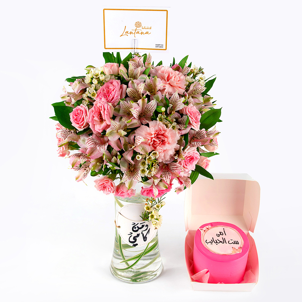 فازة تحتوي على الجوري، الكارنيشن والالستروميريا مع الكيكة.