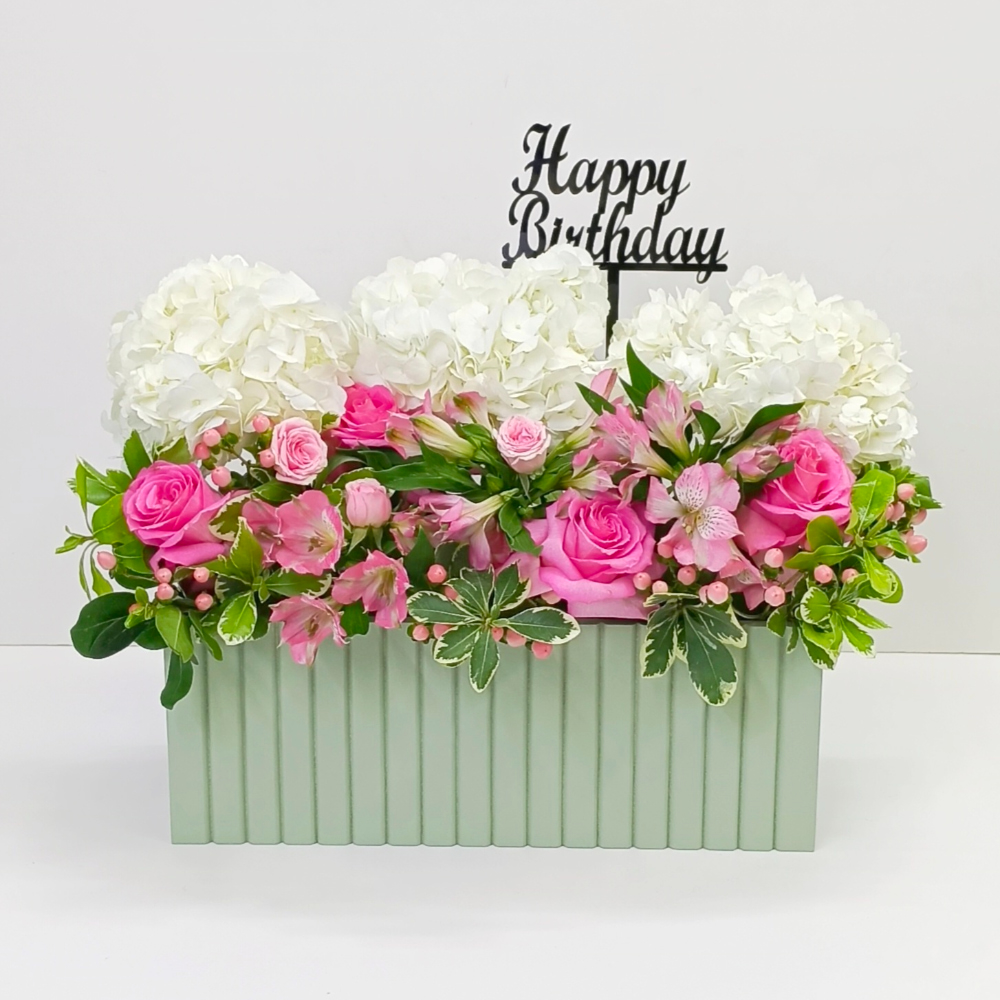باقة تحتوي على زهور الجوري، البيبي جوري الهايدرينجا والألستروميريا، مرتبة بشكل جميل في صندوق.