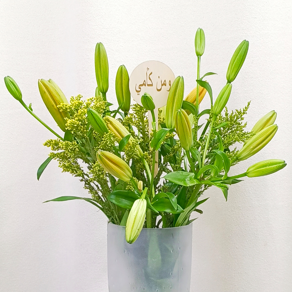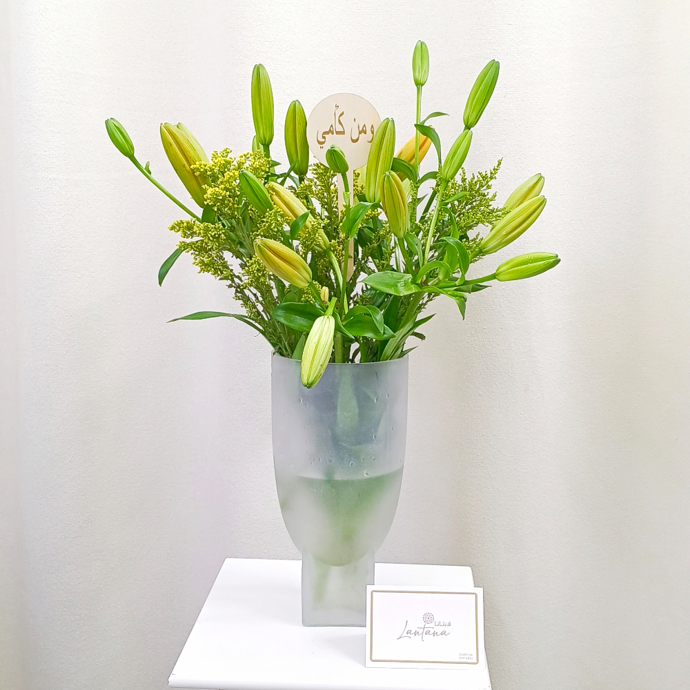 باقة تحتوي على زهور الليلي، مرتبة بشكل جميل في فازة.