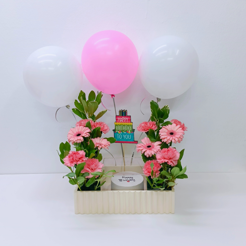 صندوق يحتوي على الجيربيرا والكارنيشن مع الكيكة والبالونات.