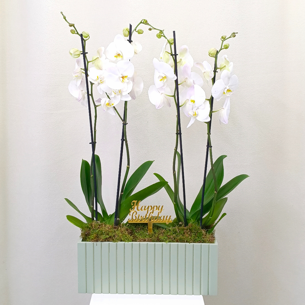 باقة تحتوي على زهور الجوري والبيبي جوري الوردية مع كيكة صغيرة، مرتبة بشكل جميل في صندوق من الأكريليك.