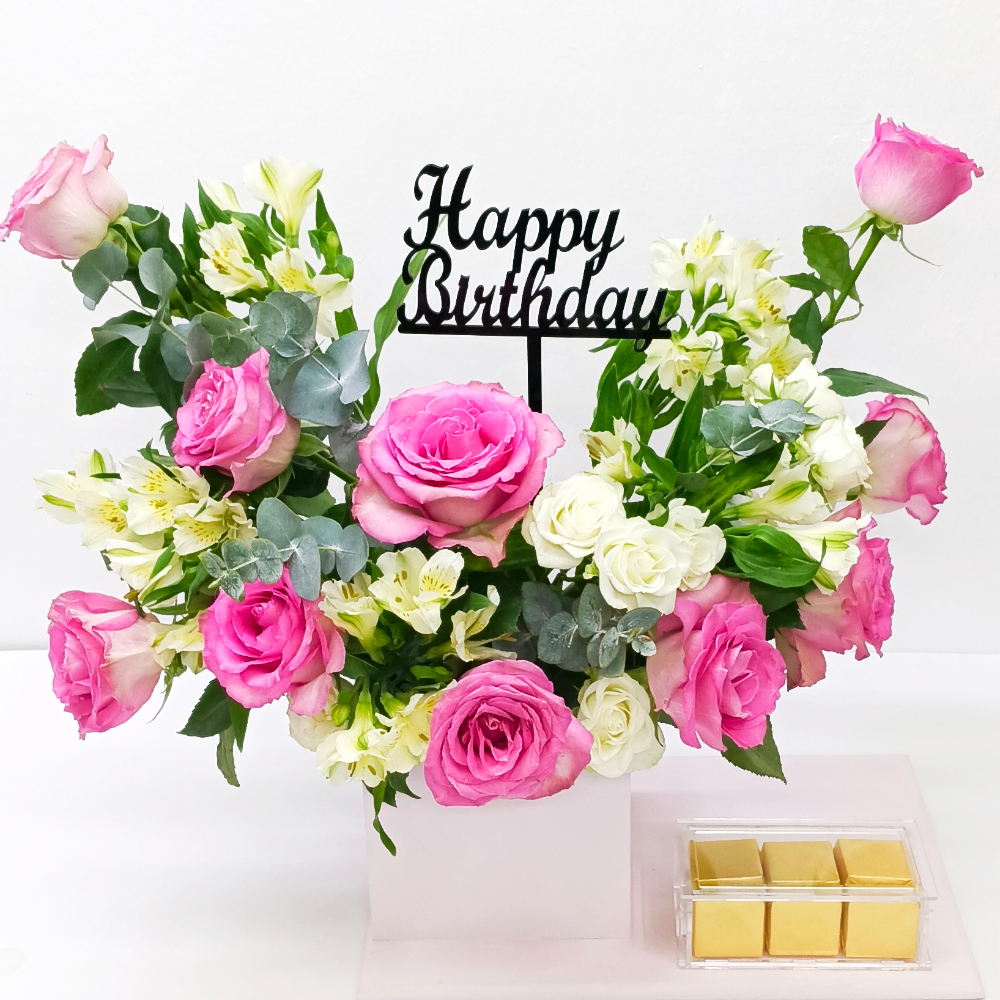 هذه الباقة تحتوي على زهور الجوري، البيبي جوري والألستروميريا مع الشوكولاتة.