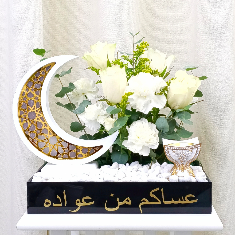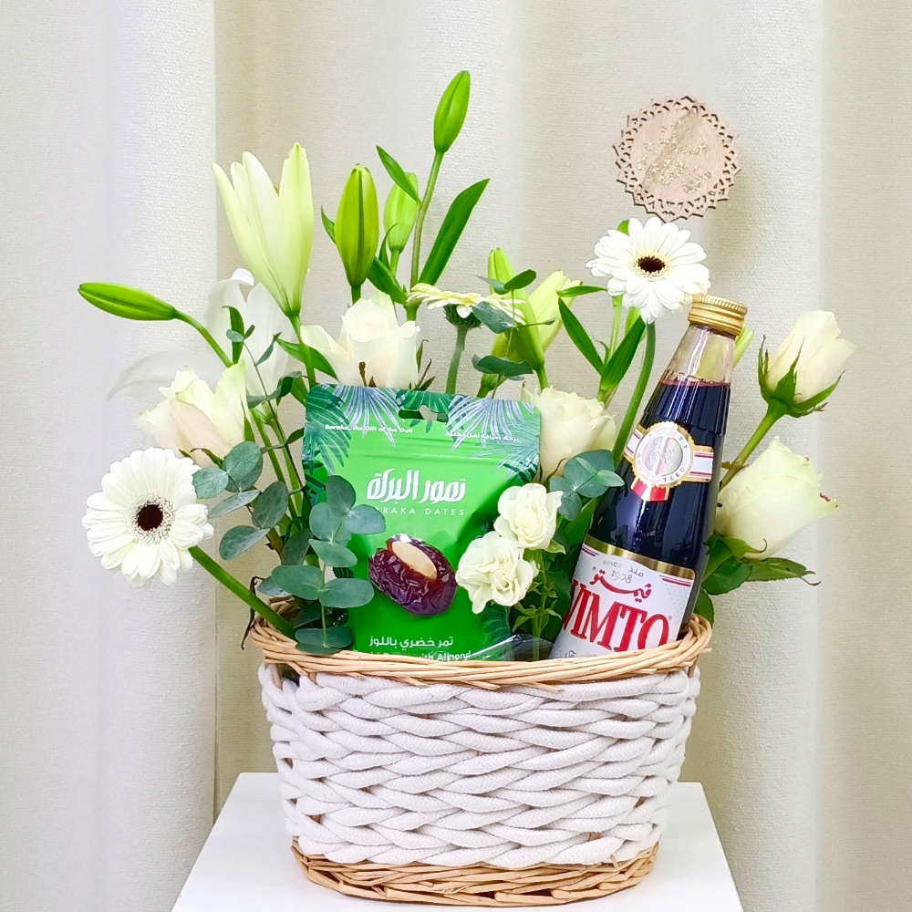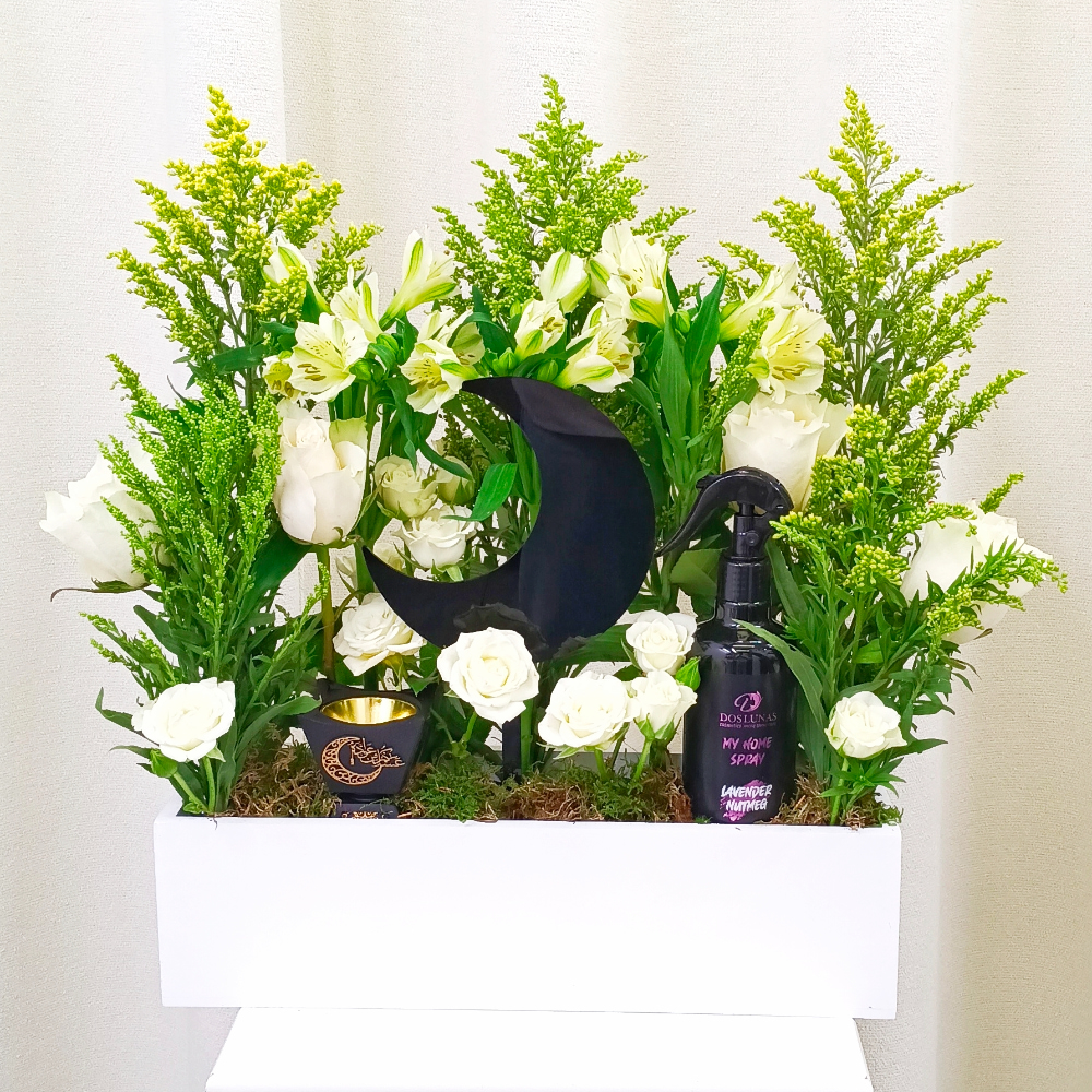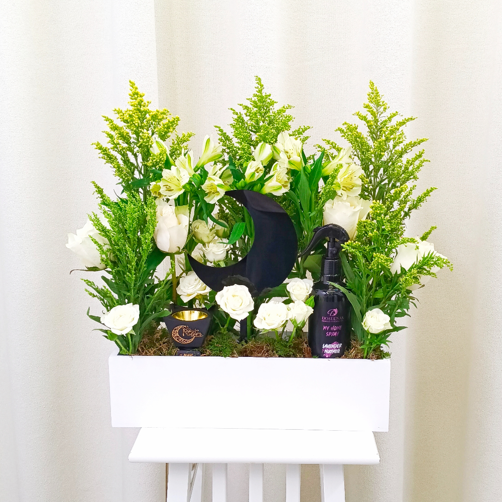 صندوق يحتوي على الجوري والالستروميريا مع العطر المنزلي والمبخر.