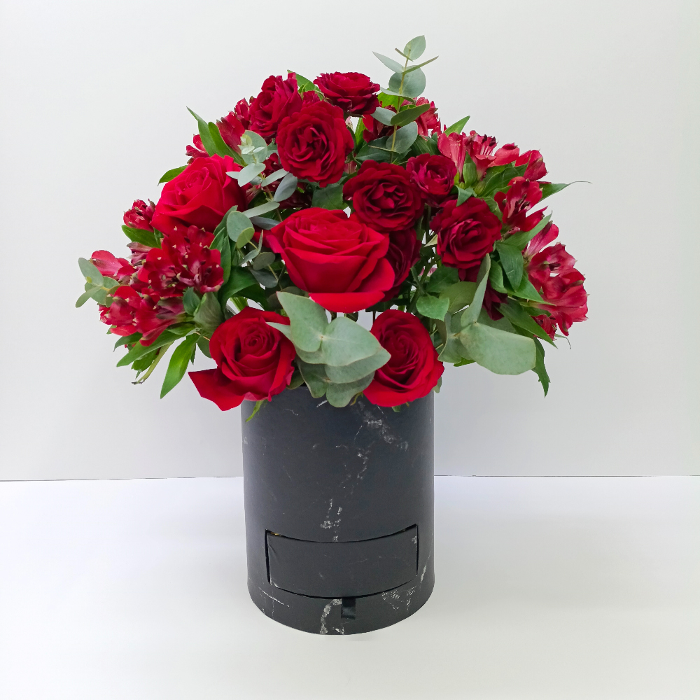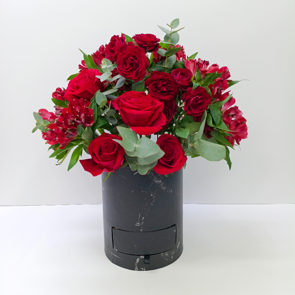 صندوق يحتوي على الجوري والألستروميريا مع الشوكولاتة.