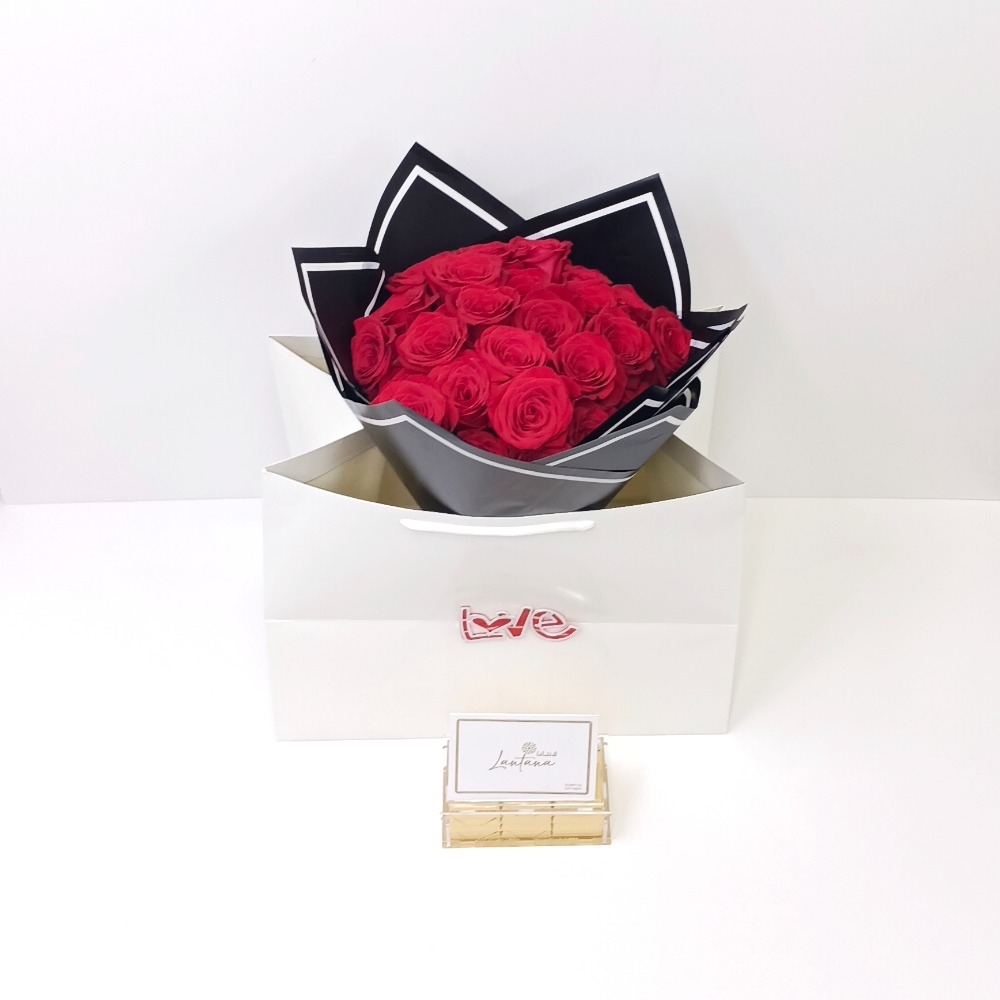 باقة يد تحتوي على الجوري مع الشوكولاتة.