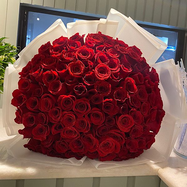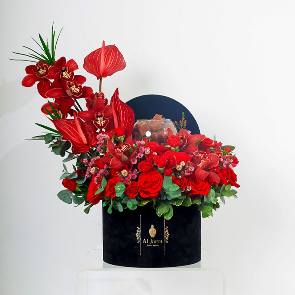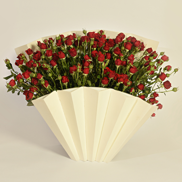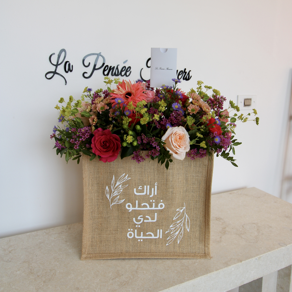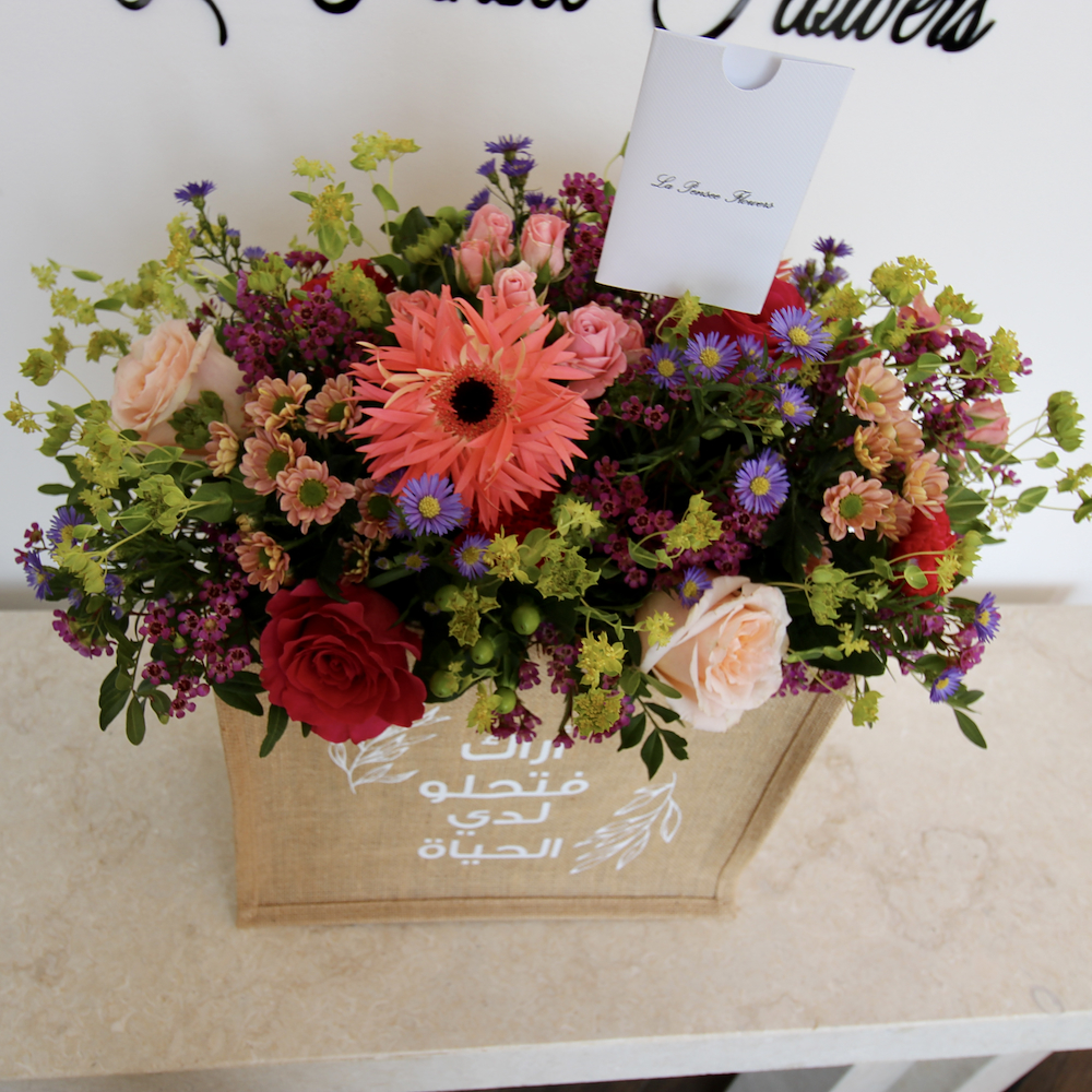 باقة تحتوي على زهور الجوري، الجيربيرا والبيبي كريز مرتبة بشكل جميل في حقيبة قماشية.