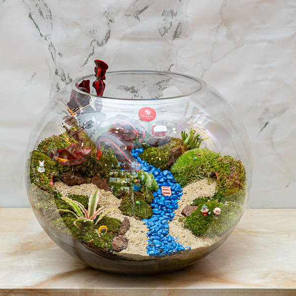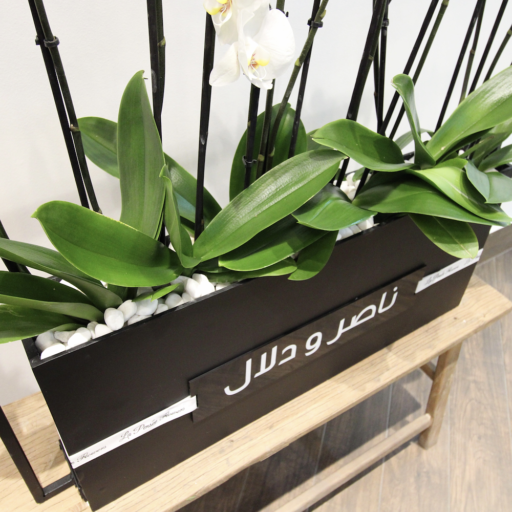 علبة خشبية كبيرة مع نباتات الأوركيد البيضاء.