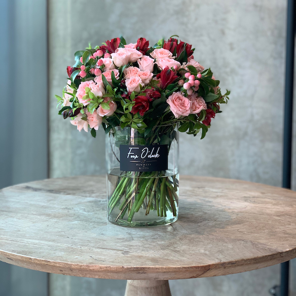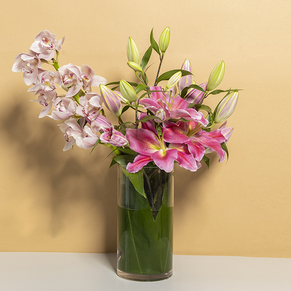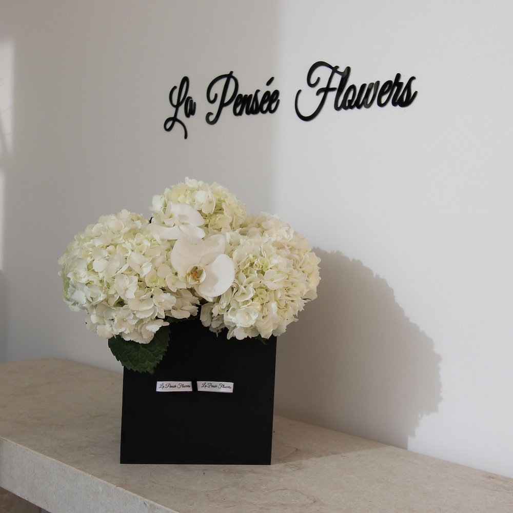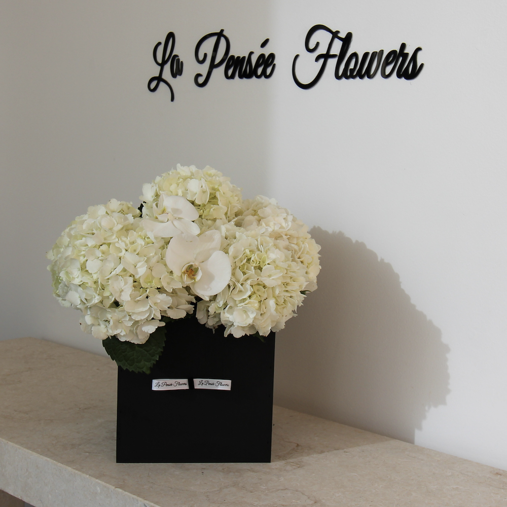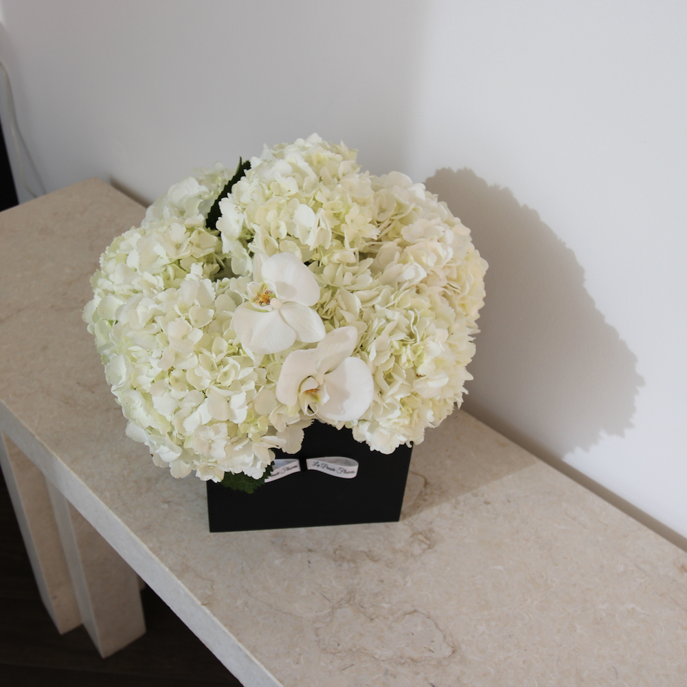 باقة تحتوي على زهور الهايدرينجا والأوركيد البيضاء مرتبة بشكل جميل في علبة خشبية سوداء.