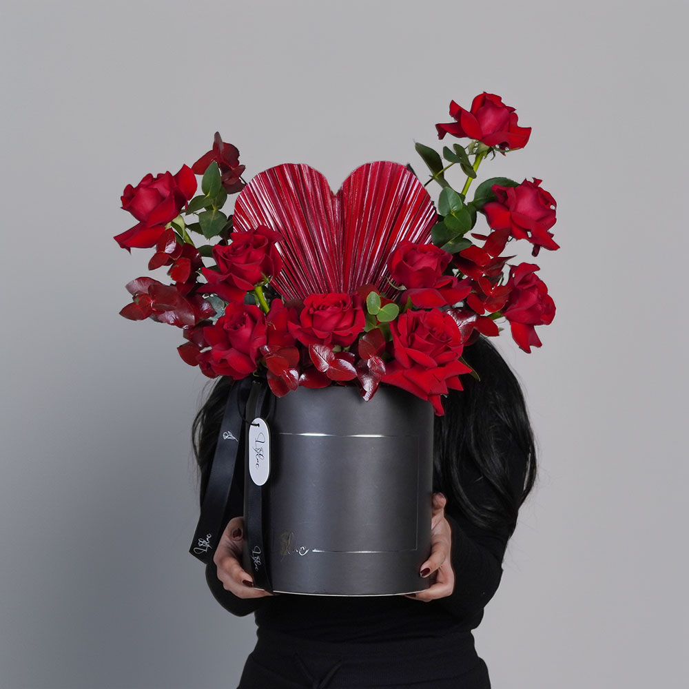 بوكس باللون الأسود يتميز بأزهار الجوري باللون الأحمر مع قلب في المنتصف.
