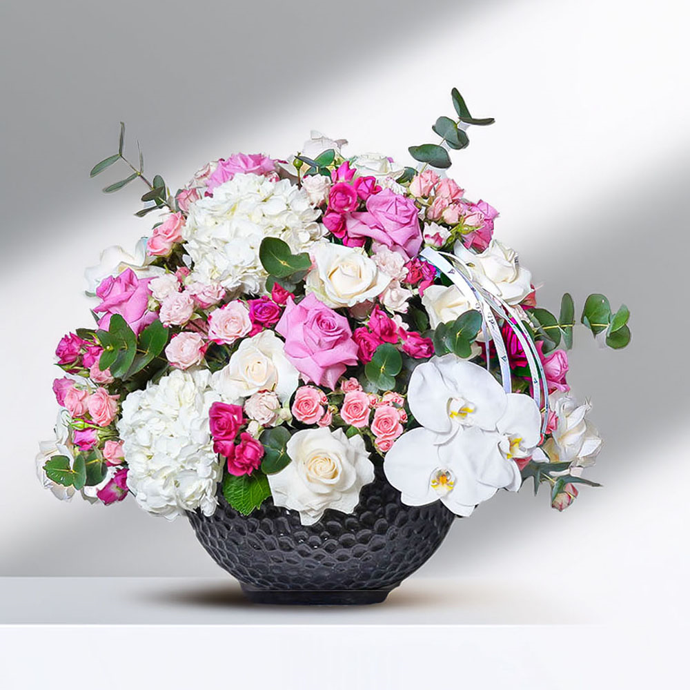 فازة بيضاء تحتوي على زهور الهايدرينجا، الأوركيد، الجوري والبيبي روز.