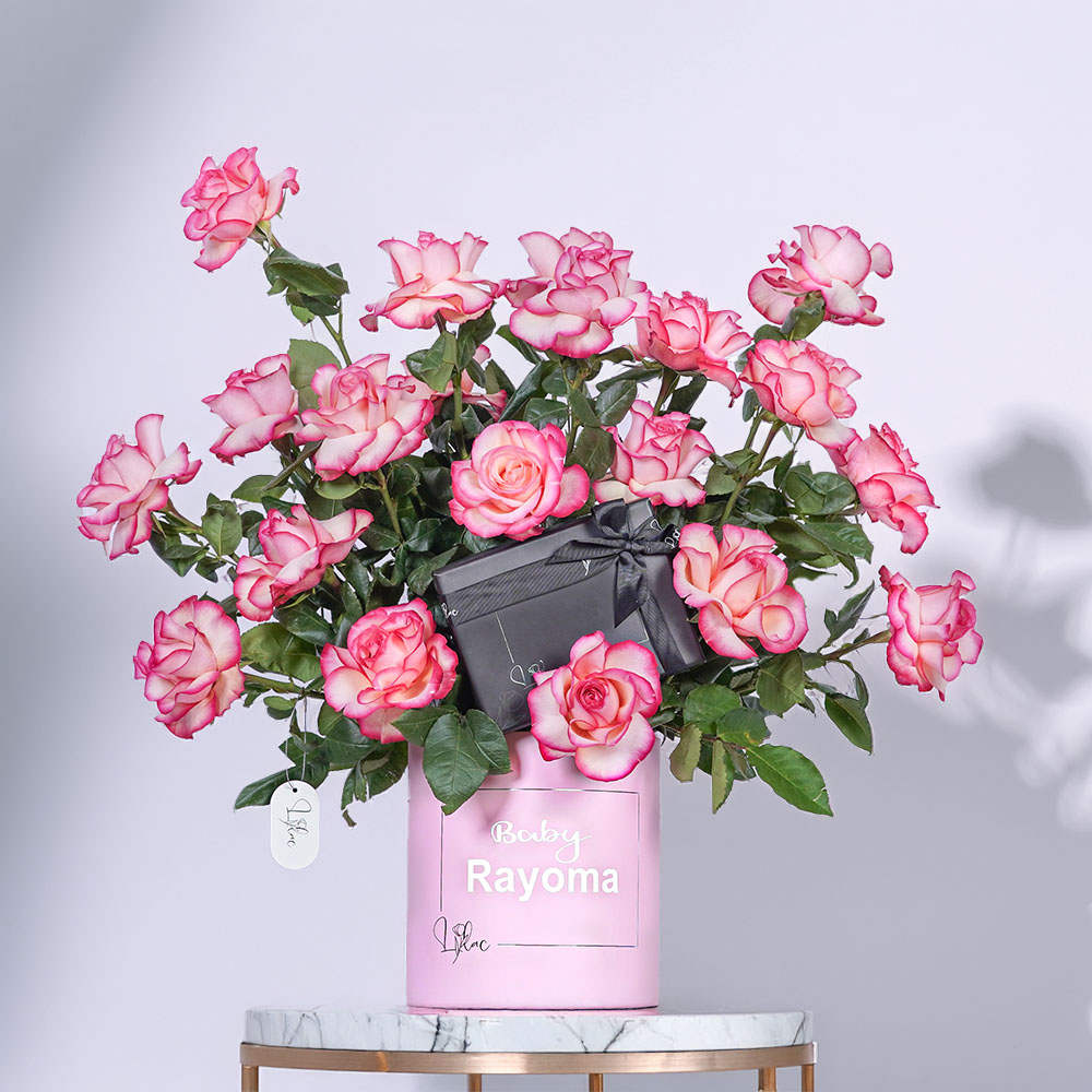 صندوق يحتوي على الجوري، الهايدرنجا والماثيولا.