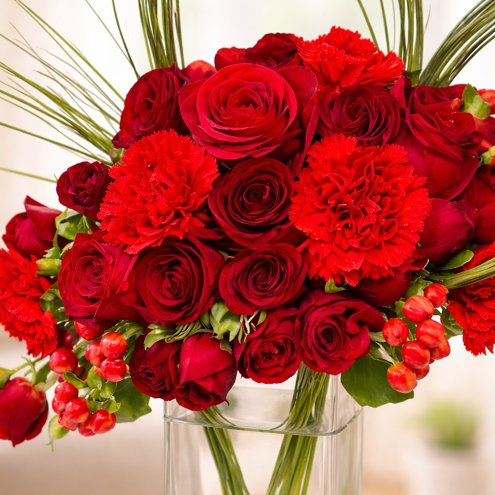 باقة من الزهور الطبيعية منسقة بشكل أنيق تتكون من زهور الجوري، البيبي جورى والكارنيشن.