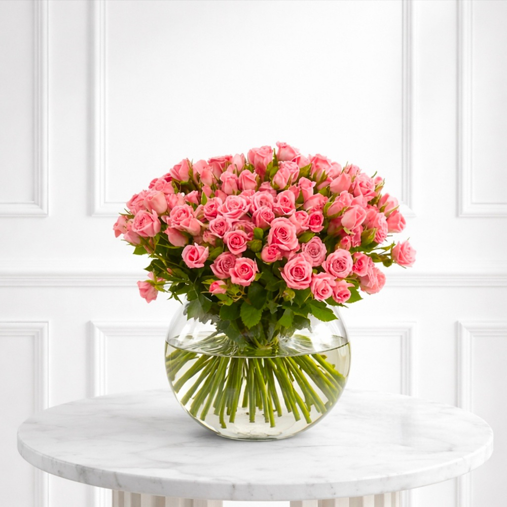 فازة أنيقة تتميز بأزهار البيبي روز.