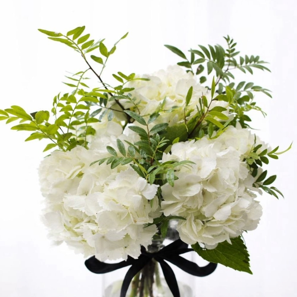 فازة من زهور الهايدرينجا الطبيعية تم ترتيبها بشكل جميل.