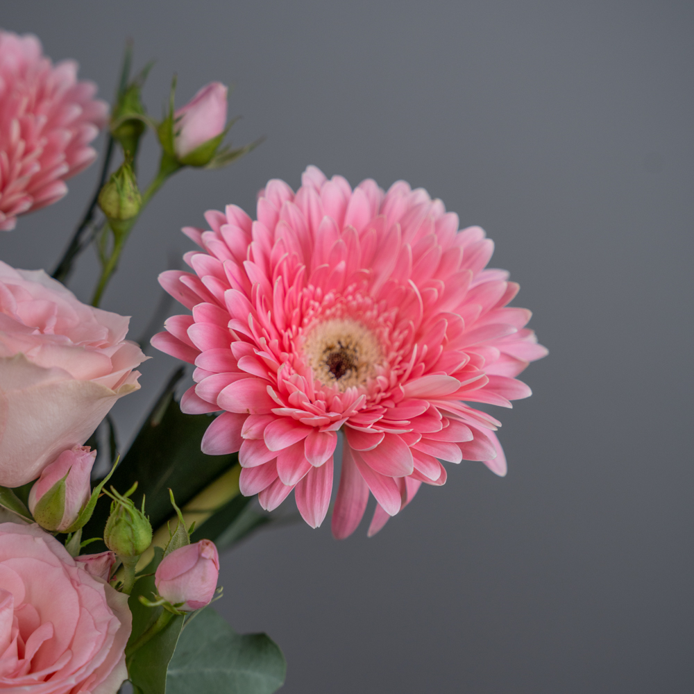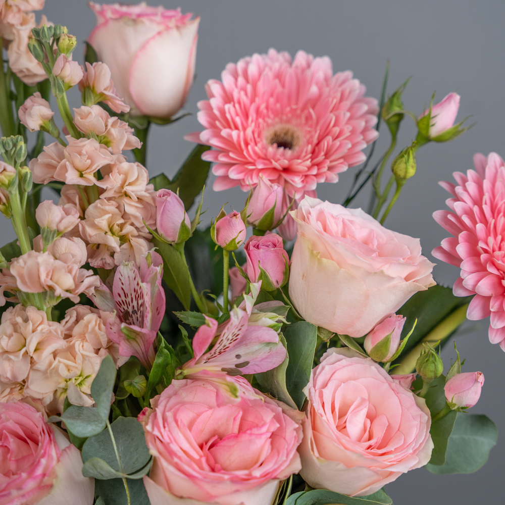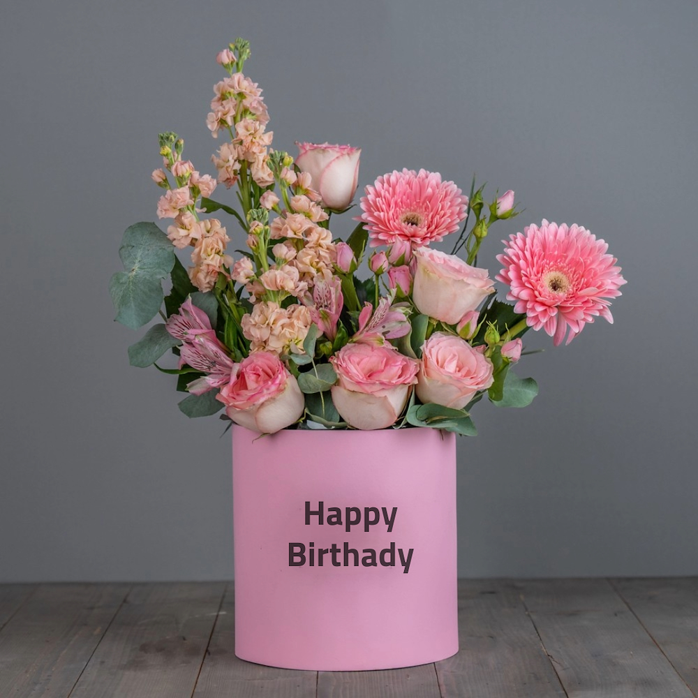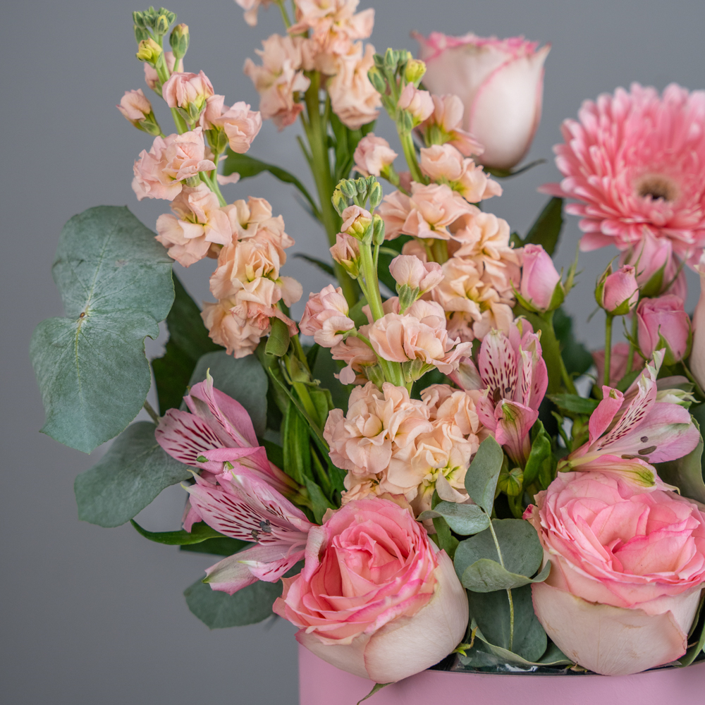 صندوق يحتوي على زهور الجوري، الجيربيرا، الماثيولا والألستروميريا.