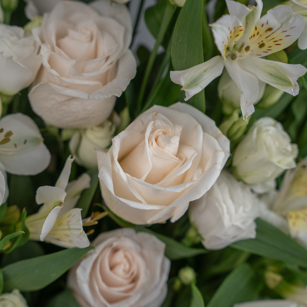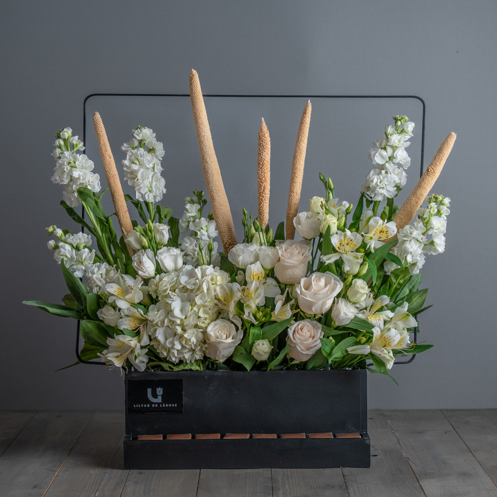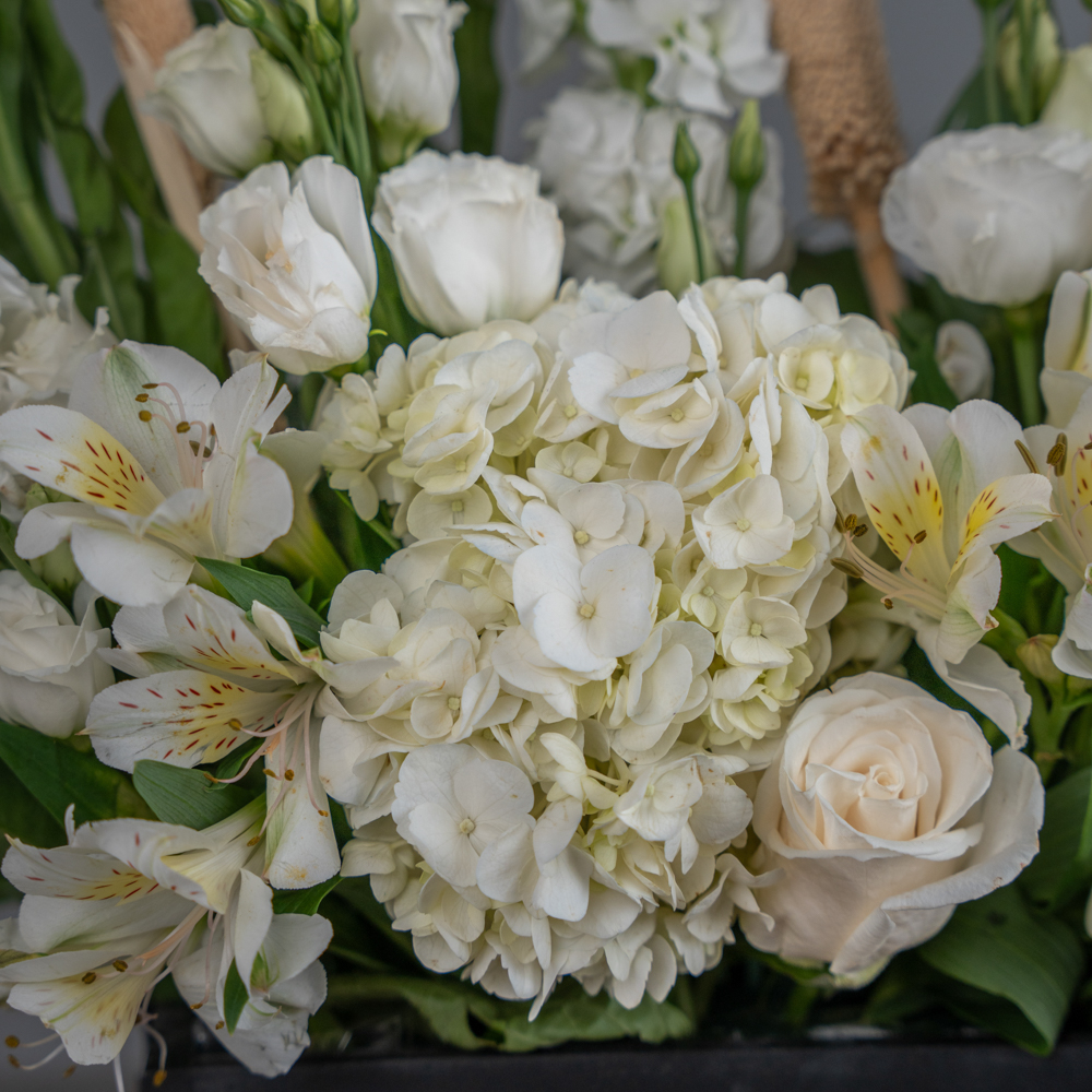 باقة تحتوي على الجوري، البيبي جوري، الهايدرنجا، الالستروميريا والماثيولا مع الشوكولاتة البلجيكية.