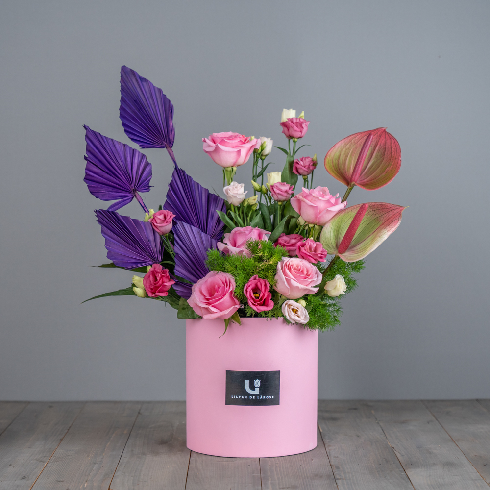 باقة تحتوي على الجوري، الاستوما والانثوريوم.