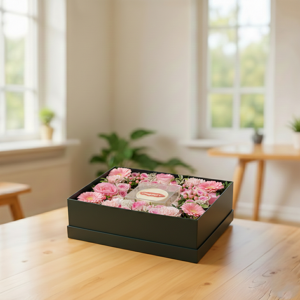 صندوق يحتوي على الجوري، الكارنيشن، الجيربيرا والهايبريكوم مع الكيكة الصغيرة.
