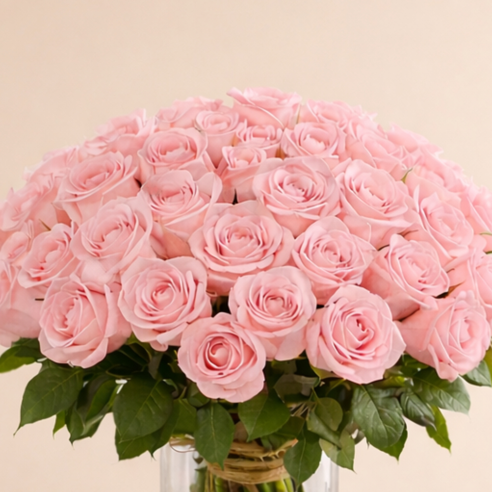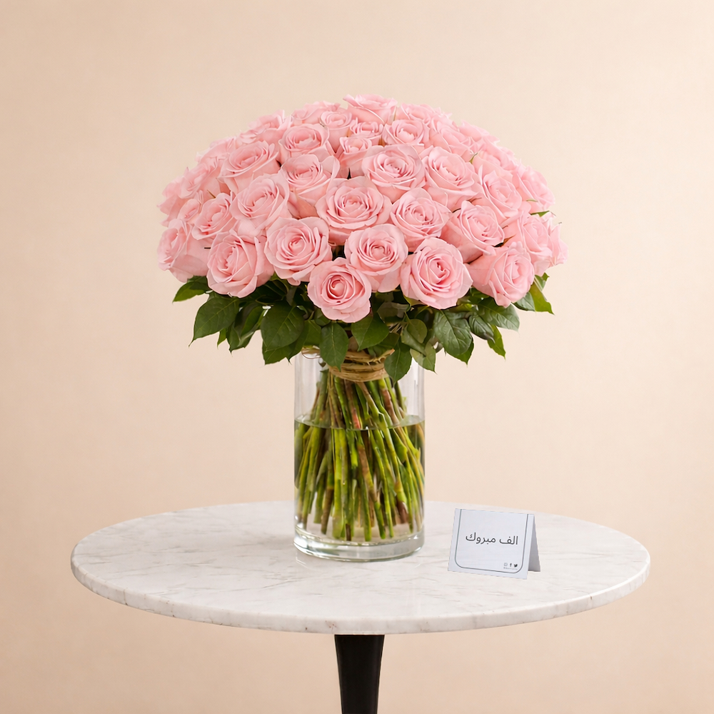 باقة من 50 زهرة جوري طبيعية تنسيقها بشكل جميل داخل فازة.