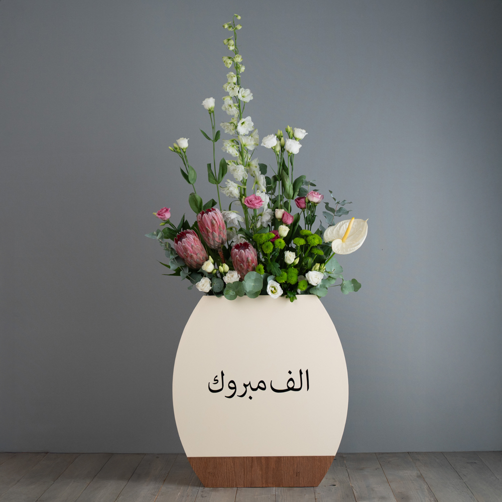 باقة تحتوي على البيبي جوري، البروتيا، الدلفينيوم والكريز.