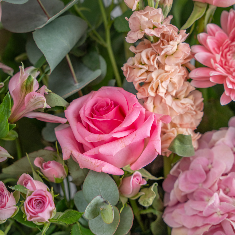 باقة تحتوي على الجوري، البيبي جوري، الالستروميريا، الجيربيرا، الانثوريوم والماثيولا.