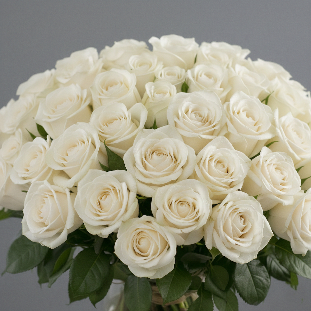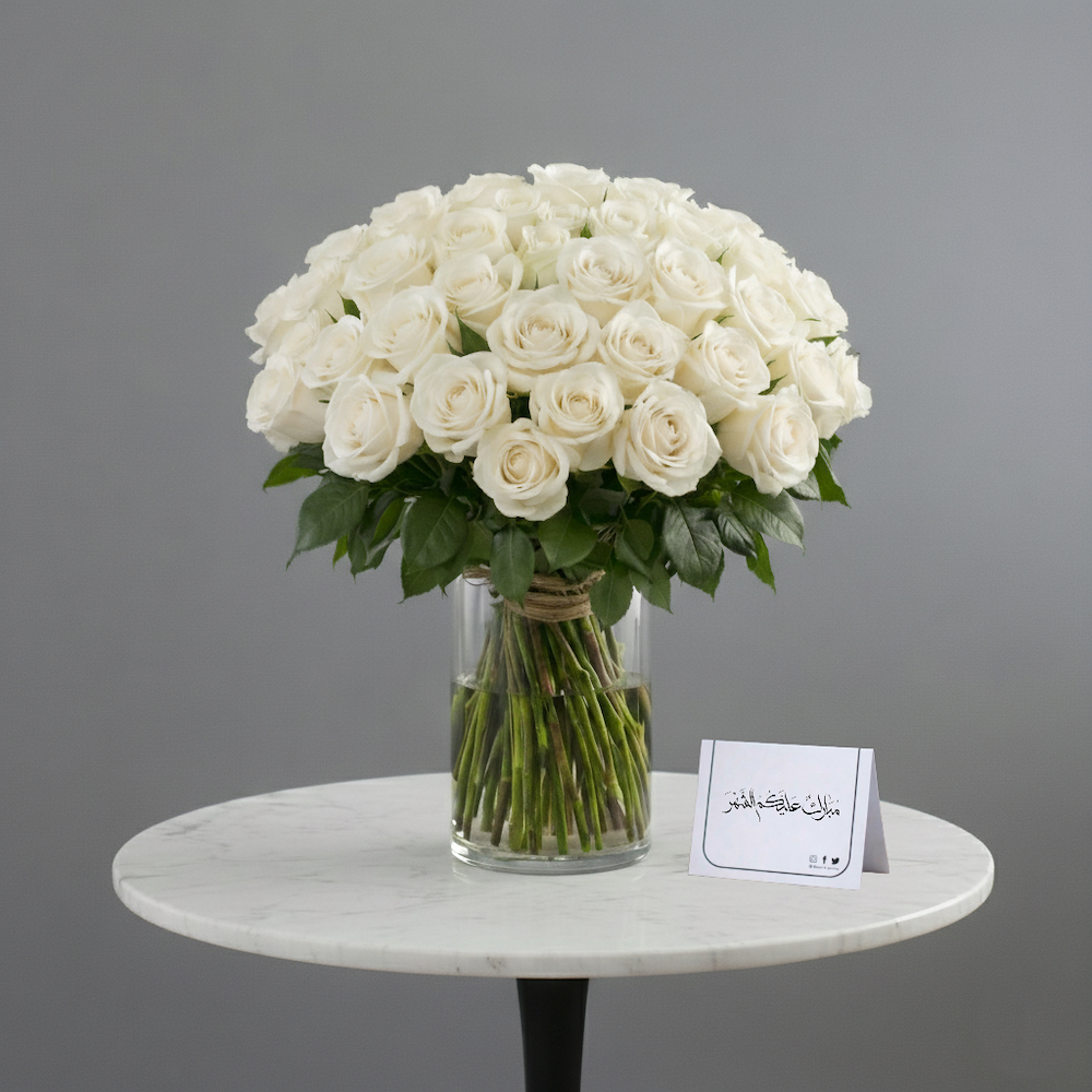 باقة تحتوي على 50 زهرة جوري بيضاء، منسقة بشكل أنيق.