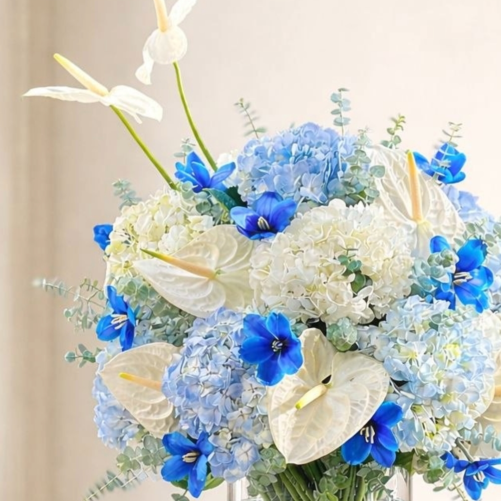 باقة من الزهور الطبيعية تتكون من زهور التوليب الزرقاء، الهايدرينجا والأنثوريوم، منسقة على فازة بشكل أنيق.