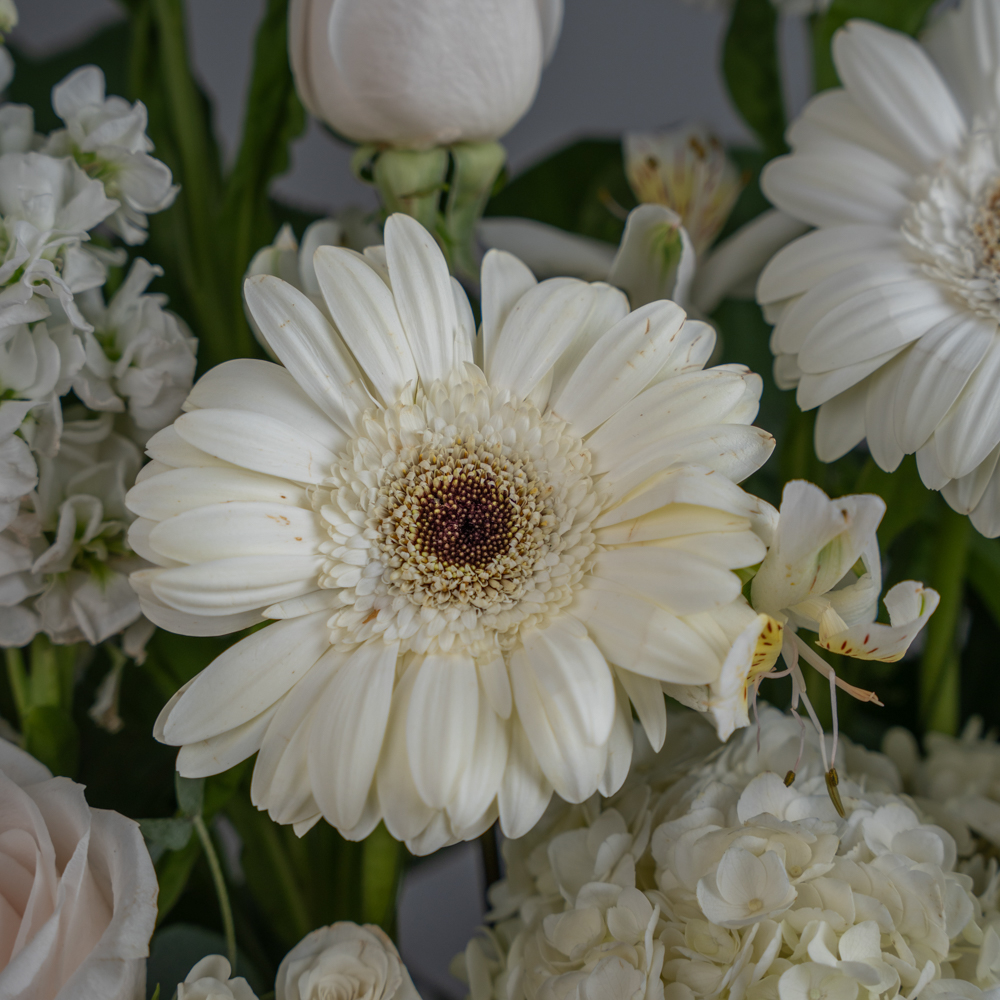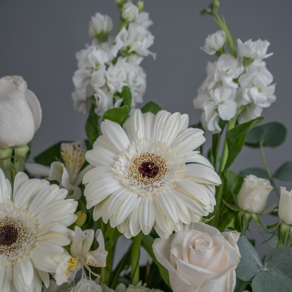 باقة تحتوي على الجوري، الالستروميريا، الجيربيرا، الهايدرنجا والماثيولا.