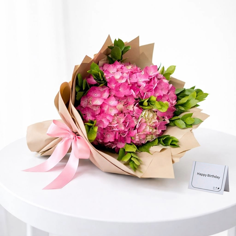 باقة يد من زهور الهايدرنجا الطبيعية تم ترتيبها وتنسيقها بشكل جميل.