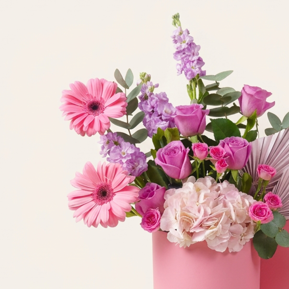 ستاند مرتب بزهور الماثيولا، الهايدرينجا، البيبي جوري والجيربيرا الطبيعية، منسقة بشكل جميل.