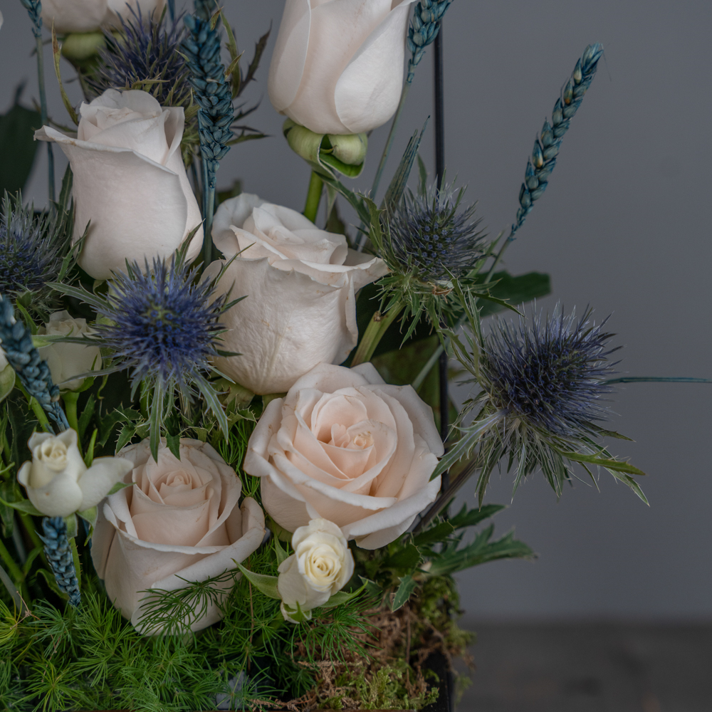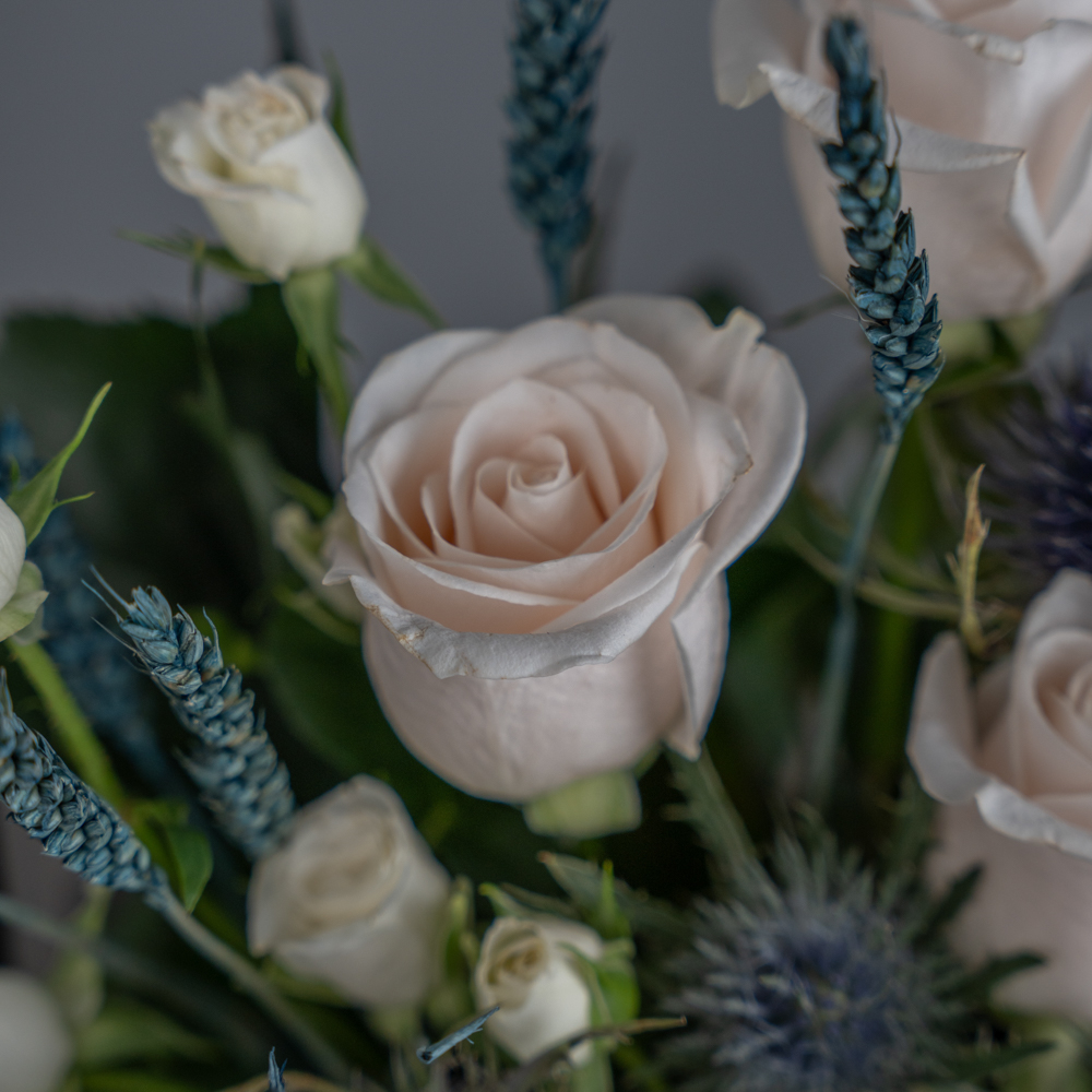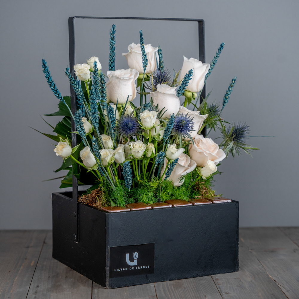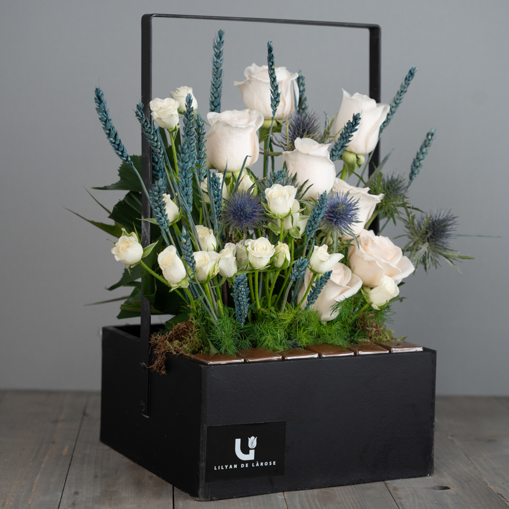 باقة تحتوي على الجوري، البيبي جوري والارينجيوم مع الشوكولاتة البلجيكية.