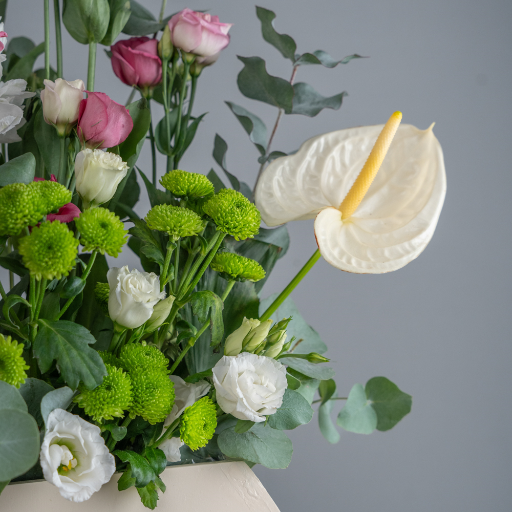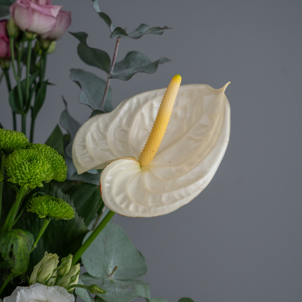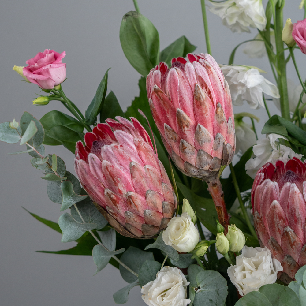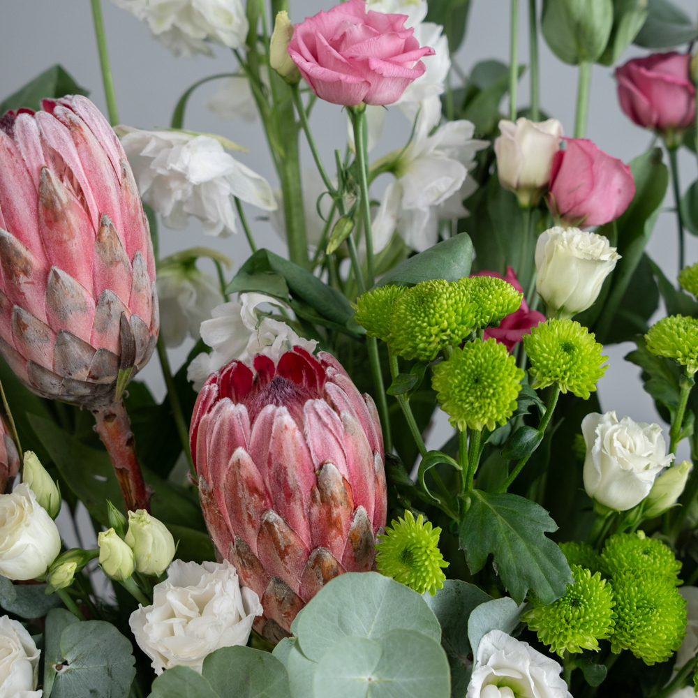 باقة تحتوي على البيبي جوري، البروتيا، الدلفينيوم والكريز.