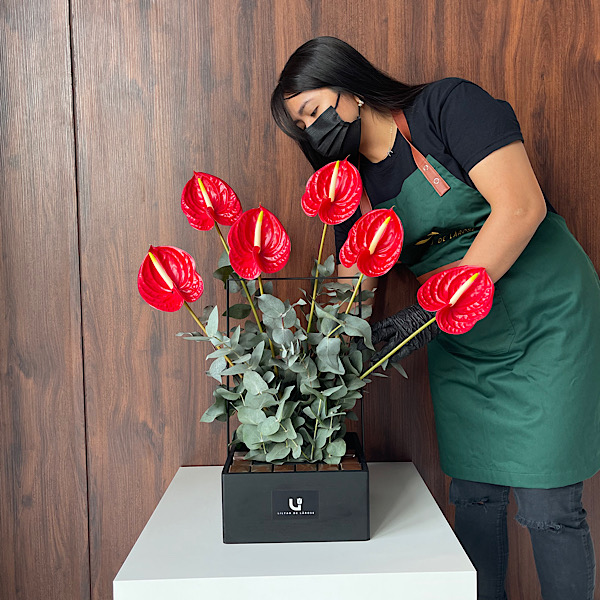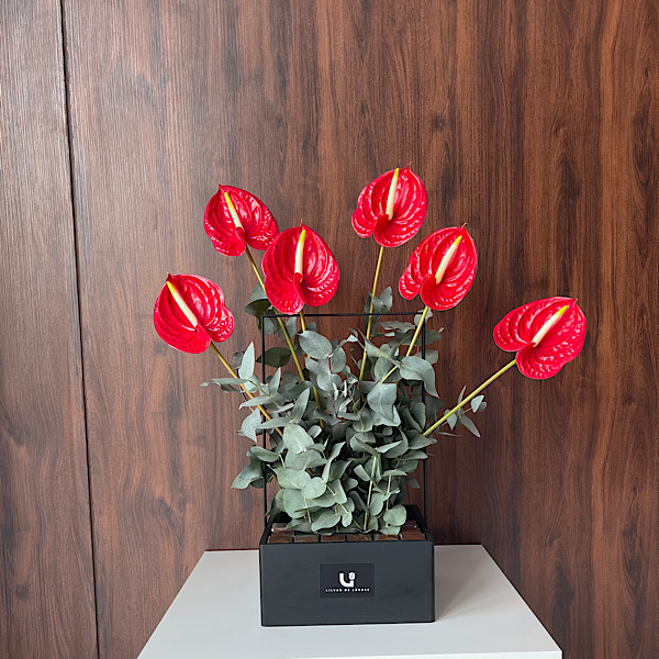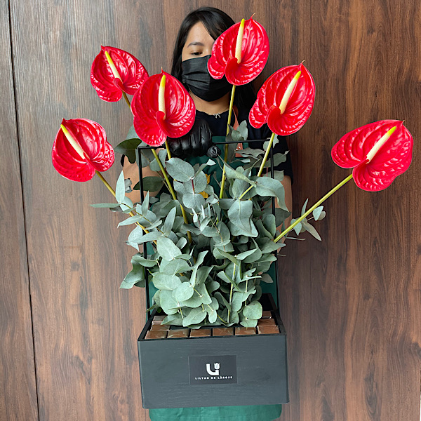 تحتوي السلة الخشبية السوداء على الأنثوريوم الأحمر والأوكاليبتوس مع الشوكولاتة البلجيكية.