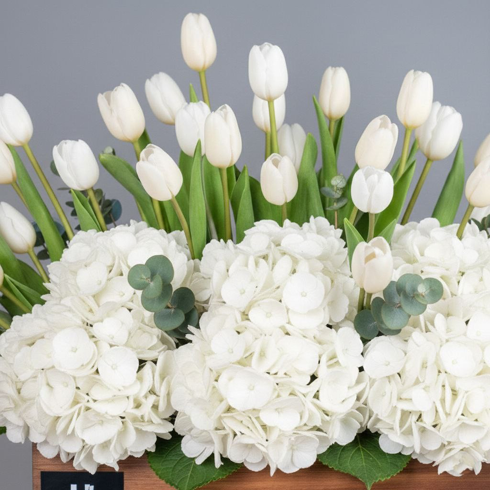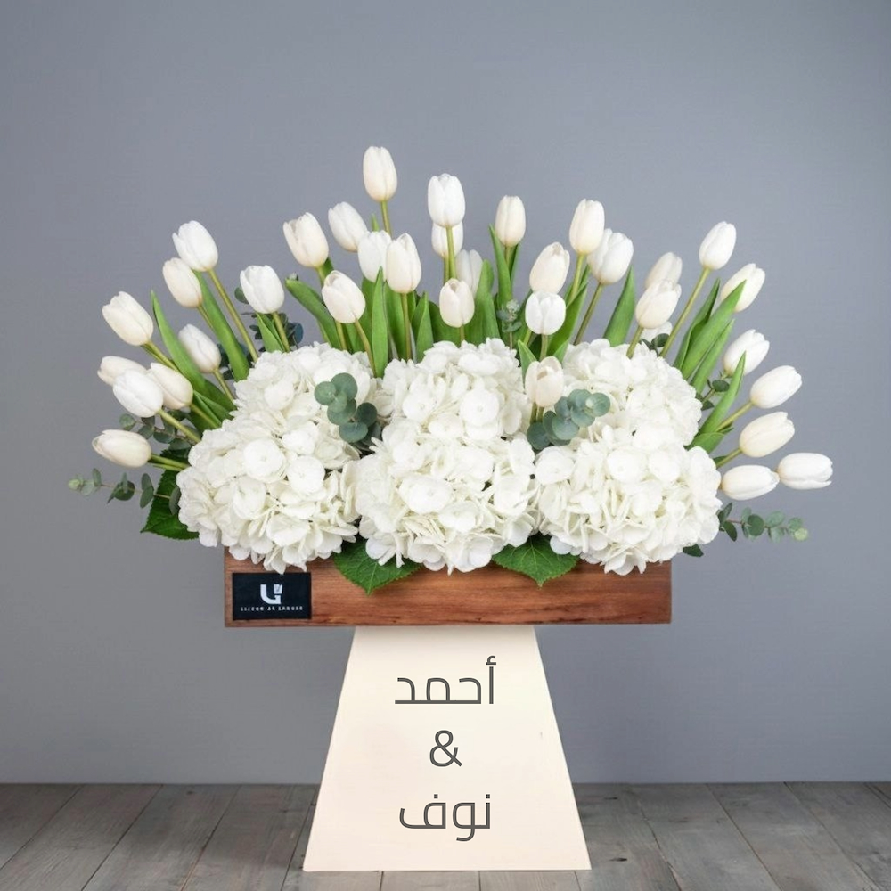 تحتوى الباقة على زهور التوليب والهايدرينجا، مرتبة بشكل جميل في ستاند.