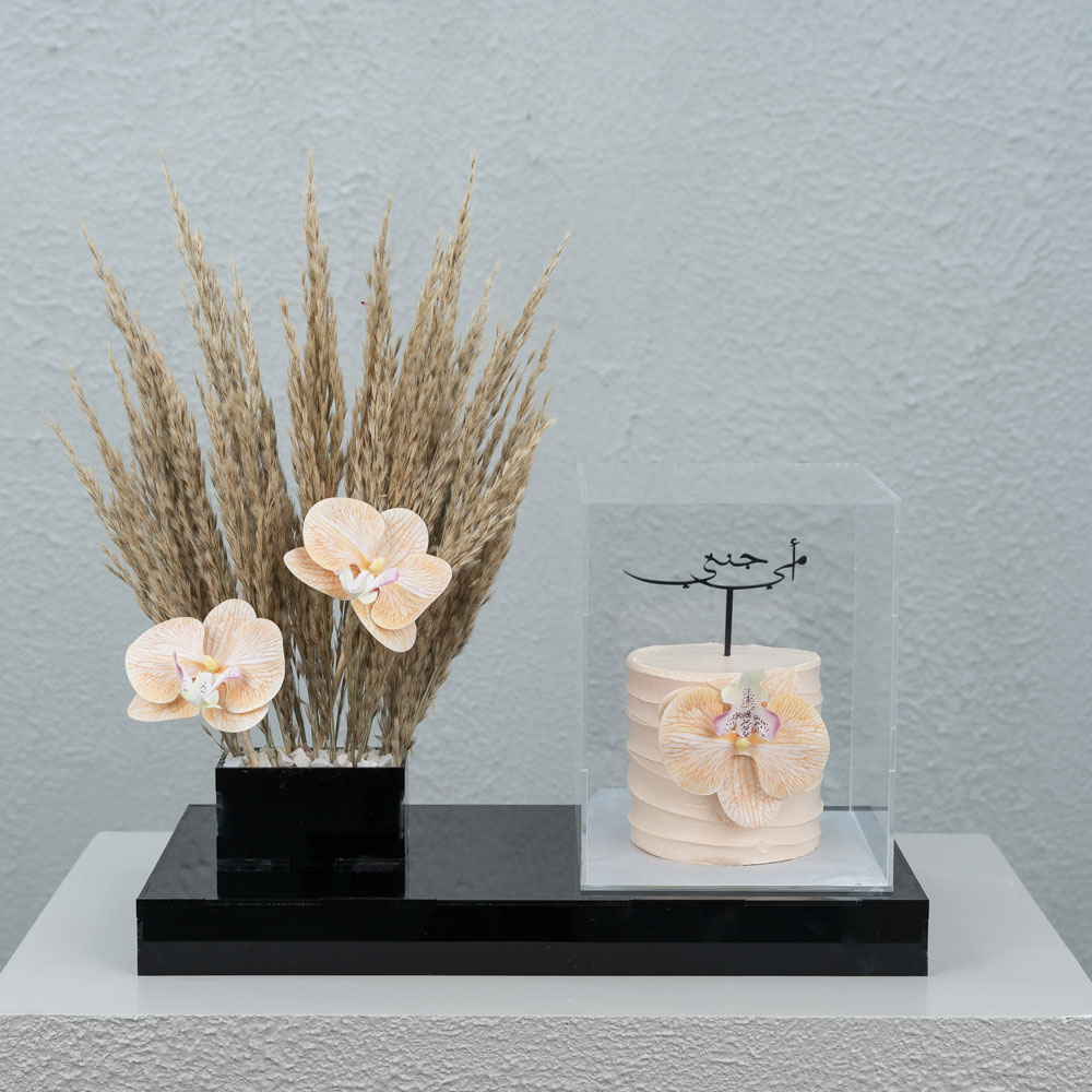 صينية من الأكريليك مزينة بزهور صناعية مع كيكة الشوكولاتة بحجم 4 إنش.