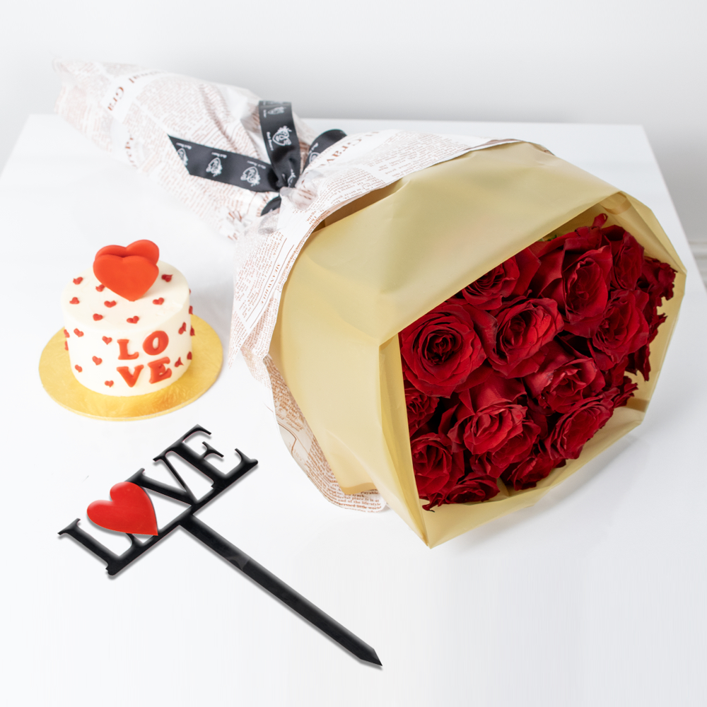 باقة أنيقة تتميز بزهور الجوري باللون الأحمر بتغليف مميز مع كيكة صغيرة بنكهة الكراميل والشوكولاتة وتغريسة من الأكريليك.