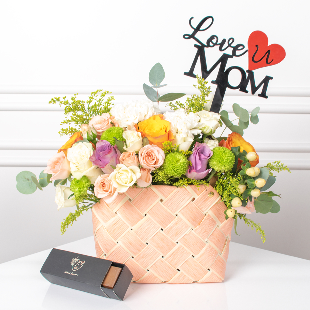 باقة تحتوي على زهور الجوري والكارنيشن، مرتبة بشكل جميل. تأتي مع الشوكولاتة وتغريسة من الأكريليك.