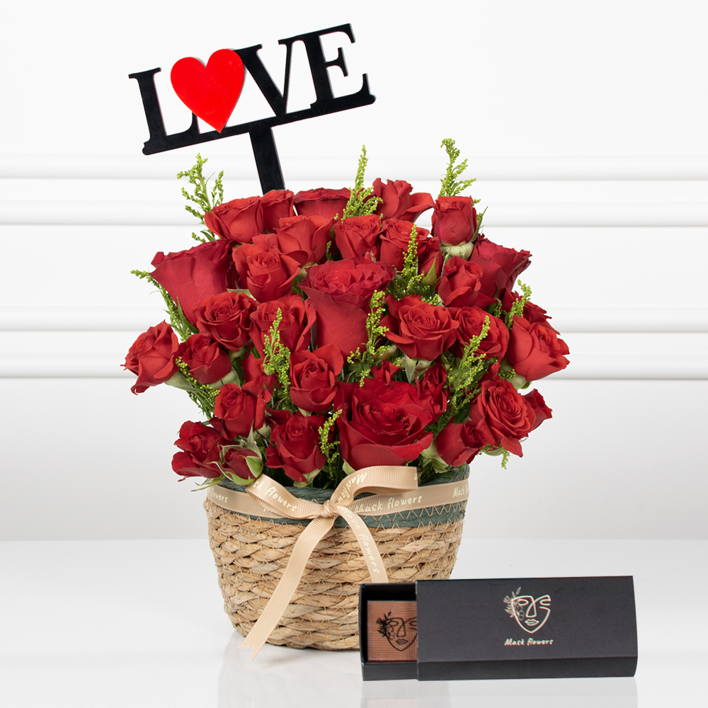 سلة مع زهور الجوري والسوليداغو مرتبة بشكل جميل مع بطاقة مع توبر أكريليك مع علبة شوكولاتة صغيرة.